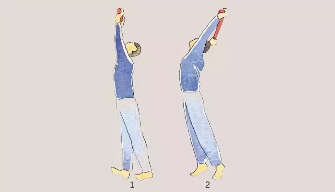 1.两手向上高举,上身后仰,
