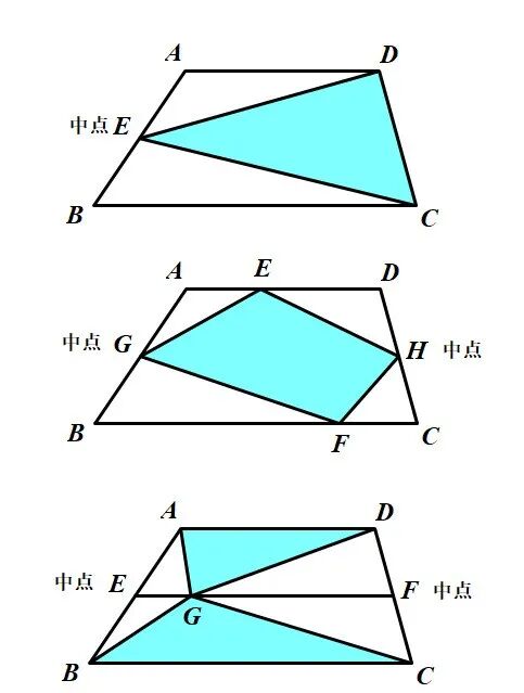 结论三:梯形ABCD中,E是腰AB的中点,F是腰CD的中点,G是EF上的一点,则三角形ADG和BCG的面积之和是梯形ABCD的一半。
