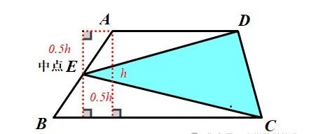 结论一:梯形ABCD中,E是腰AB的中点,则三角形CDE的面积是梯形ABCD的一半。
