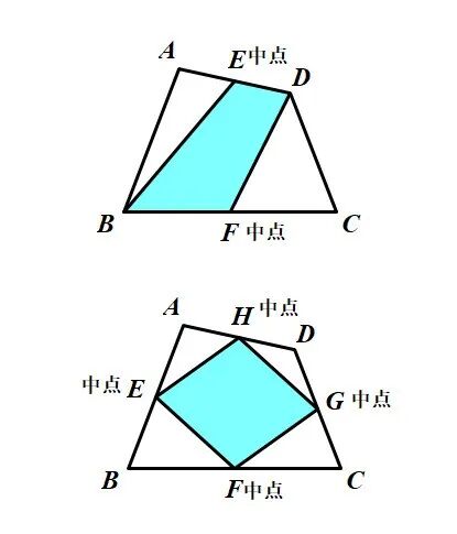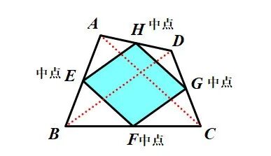 这个结论的证明过程需要连接AC和BD,根据E、F、G、H都是中点可得,三角形AEH的面积是ABD的1/4,三角形CFG的面积是CBD的1/4,二者相加可得,三角形AEH与CFG的面积之和是ABCD面积的1/4。类似可得,三角形BEF与DHG的面积之和是ABCD面积的1/4。由于四边形ABCD被分割为4个小三角形和中间的四边形,因此中间的四边形EFGH的面积是ABCD面积的一半。