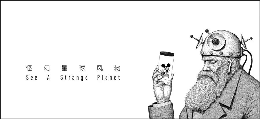 达尔文的脑门盖上了圆钢帽,上面插着小雷达。他将一个实验瓶举至齐眉,以科学家的严肃态度端详着,表情凝重。实验瓶中是一个众所周知的物种……确切地说,是骑着玩具车的米老鼠。