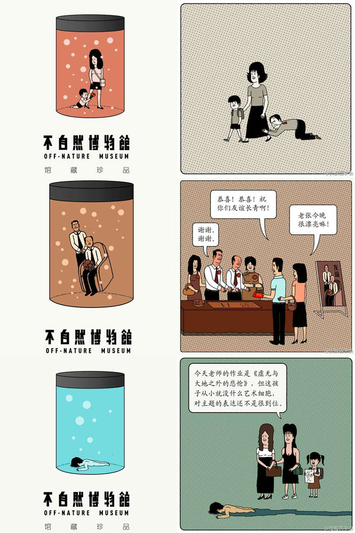 作为吸引了15万粉丝的微信公众号,“负波普”以一套名为“不自然博物馆”的连载漫画,一期一个的荒谬小故事,说明书般展示一个个“收集”于实验瓶中的人类样本,读者激赏并称之为“脑洞异常性感”。