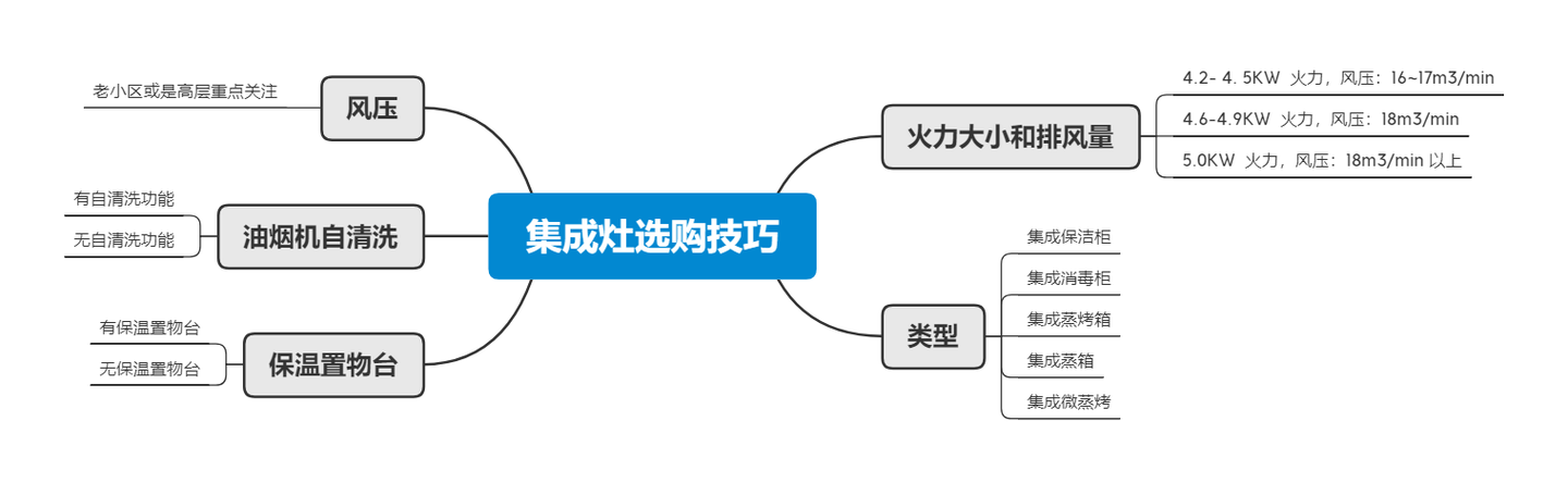 新家装修,最期待的就是厨房的集成灶了,提前两个月就在选型了,不看不知道,一看吓一跳,之前以为集成灶就是油烟机搭配燃气灶,选型的时候才发现,原来集成灶也有很多类型。 像集成保洁柜、集成蒸箱,集成蒸烤箱等等,跑了一个月线下店对比之后,终于总结出了一套小白也适用的集成灶选购技巧! 用了三天时间,终于把这篇文章写完啦,文章中包含了32款集成灶的参数对比和适用体验,希望能对小伙伴们有所帮助喔~! 想单独买油烟机的,可以看这篇: 看了这么多,相信大家对油烟机已经有所了解了,最后再给大家按价位总结一下: 康佳 KDD13/KD04/KD22/KD05 的性价比还是很高的。 想要集成蒸烤箱的话,推荐荣事达变频蒸烤消一体灶; 想要消毒柜的家庭推荐顾家 集成灶一体式。 想要蒸烤箱的话,好太太 集成灶蒸烤一体灶和华凌JJZT-WX9 都是不错的选择,好太太集成灶的火力会稍大一些; 美的 JJZT-J080X 和森歌 森歌天悦 T3BZ 集成灶都是不错的集成烤箱。 不过美的 JJZT-J080X 是还有烤箱的功能,喜欢烘焙的话,推荐美的 JJZT-J080X。 方太集成烹饪中心A-MAX系列(P1+02-X2.i) 话说“巧妇难为无米之炊”,我倒认为厨房设备在美食的制作过程中,也起着决定性的作用,而且我也相信绝对有朋友会因厨房设备不给力,是不进厨房的。它不仅决定美食的口感,还影响着做饭人的意境,所以一套给力的厨房家电极其重要。 说到这里就一定要介绍方太集成烹饪中心~ 方太集成烹饪中心采用上排集成的创新差异化模式,油烟顺势上排,更符合热空气自然向上流动的物理规律,同时搭载烟烹联动功能,使用更智能更方便。嵌入式的设计更让机器与原厨房设计风格进行更好的融合。 最近我留意到方太出了新品-方太集成烹饪中心A-MAX系列(P1+02-X2.i),它就是一款集6大厨电功能为一体的、引领高端厨电的设备。 1字型超薄机身,设有0-26°的开合角度,让烹饪时眼前没有任何障碍,更能掌控烹饪食材的状态;整个机身也是高颜值,质感强,整个设备在厨房里一安装,彰显着高端大气,而且还有种想做饭的冲动! 吸油烟模块采用上排烟设计,这就与传统集成灶下排烟拉开了距离,它配置的是直流变频强擎电机和智能巡航增压3.0,配合1+2组合进烟口设计,底部精准对接双灶口,行成近距离低吸模式,什么爆炒、油炸统统都是速排油烟,瞬间吸走;如果是蒸煮的话,也能够将水汽排出干净; 其次是灶蒸烤模块。 燃气灶功能拥有5.0kW的大火力,65%的热效率,也是相当的给力,配合使用隔热聚能罩,猛火爆炒时也不烤人。蒸烤模块拥有42L的大容量,支持36种烹饪方式,还具有空气炸锅功能,解锁了更多制作美食的方式。蒸功能采用第三代蒸汽技术,能够及时快速锁住水分。烘烤模式采用的立体热风,使食材上色更均匀。而新增空气炸锅功能,低脂更健康,智控排湿也可以让口感变得外焦里嫩,孩子们爱吃的鸡翅都可以在家天天做;而且整个内腔是瓷膜不锈钢内胆,耐高温还易清洁。 整个方太集成烹饪中心采用的都是触屏式一体界面,使用上非常的方便,不管是其中任何一个模块,都是高配置真实力的表现,安装上一套方太集成烹饪中心A-MAX系列(P1+02-X2.i),不想进厨房都难。#厨房大家电唤醒新生活# SCHNEIDER JJZT-WXA-T6ZK 和美的 JJZT-HM5Y 都是具有蒸烤功能的。 想要火力大一些就选SCHNEIDER JJZT-WXA-T6ZK 。 想要火力小一些就选美的 JJZT-HM5Y 。 一、集成灶选购技巧 集成灶在选择是需要注意火力大小和排风量、类型、保温置物台、油烟机自清洗、风压等参数,为了方便大家查看,我特地做了张思维导图。 1、火力大小 集成灶的燃气灶火力选择时,可以根据平时做饭的习惯来决定,燃气灶火力大致可以分为4.2- 4. 5KW 、4.6-4.9KW、 5.0KW 及以上。 平时做饭喜欢爆炒的话, 5.0KW 及以上的火力就很合适啦,日常使用的话,其实4.2- 4. 5KW 和4.6-4.9KW都是OK的。 排风量和火力大小的匹配的,一般4.2- 4. 5KW 火力的集成灶排风量在16~17m3/min; 4.6-4.9KW 火力的集成灶排风量是18m3/min; 5.0KW 及以上火力的集成灶排风量在18m3/min 以上,开放式厨房的话,可以选择排风量大一些的。 2、类型 集成灶的类型主要有:集成保洁柜、集成消毒柜、集成蒸烤箱、集成蒸箱、集成微蒸烤等等。 家里有小宝宝或者定期餐具消毒的话,推荐集成保洁柜或者集成消毒柜,喜欢烘焙的话,集成蒸烤箱、集成蒸箱就很完美;预算高一点的可以考虑更高端的集成微蒸烤集成灶。 3、保温置物台 保温置物台对平时经常有人加班的家庭还是很友好的,保温个饭菜都是很方便的,不需要重新热了。 4、油烟机自清洗 目前大部分油烟机都有自清洗功能,就省去了很多清洁的烦恼,上班比较忙的小伙伴的时候要多关注下是否有自清洁功能喔~ 5、风压 风压对老小区或是高层的小伙伴都是比较重要的,特别是做饭高峰期油烟排不出的家庭,在换集成灶的时候要注意,高层的话400Pa 以上都是完全够用的。 1、康佳KDD13/KD04/KD22/KD05 优点:这款集成灶从外观上来看非常的简约大气,集吸油烟机 + 烹煮灶台 + 消毒柜为一体,使用起来很方便。 能蒸能烤,还能加热保温食材,多功能炉灶让做菜更简单~外置电动式水箱,可自由加水,食物蒸出来更加水嫩新鲜。 5.0KW 大火力,炒菜更迅速,无需多等即可吃上可口饭菜。 还有自动清洗功能,超适合懒人哦! 也很适合上班族或者家里有孩子上学,没时间照顾孩子吃饭的家庭,把做好的饭菜放在恒温热菜板上就能让食物