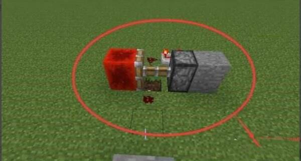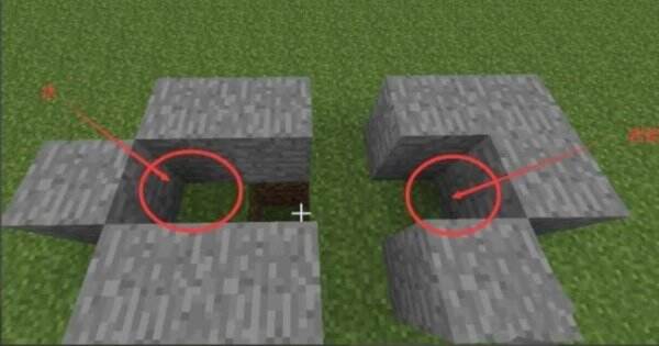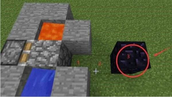 2、然后在另一个缺口的第三格放置一个黑曜石,目的是为了不让石料被推的太长。或者用着石头堆一个甬道,方便石料运行。
