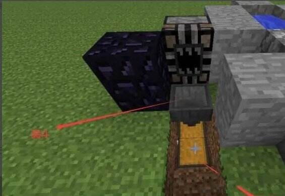 3、在黑曜石和刷石机缺口中间的旁边放置一个方块采掘器,采掘口面朝石料产出方向。