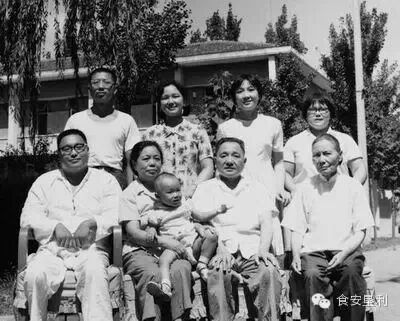 邓小平七十大寿全家福(1974年8月22日)。前排左起:邓朴方、卓琳、外孙女眠眠、邓小平、夏伯根,后排左起:邓质方、邓楠、邓榕、邓林。