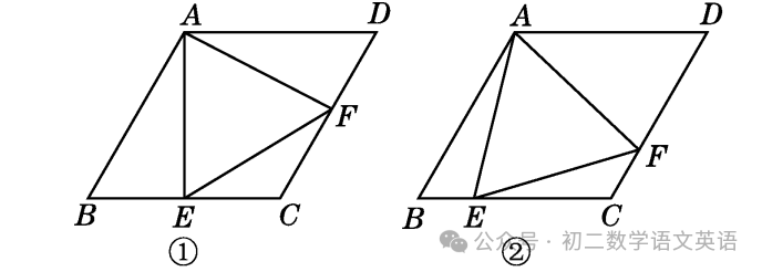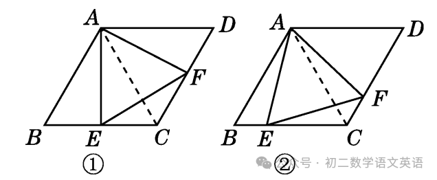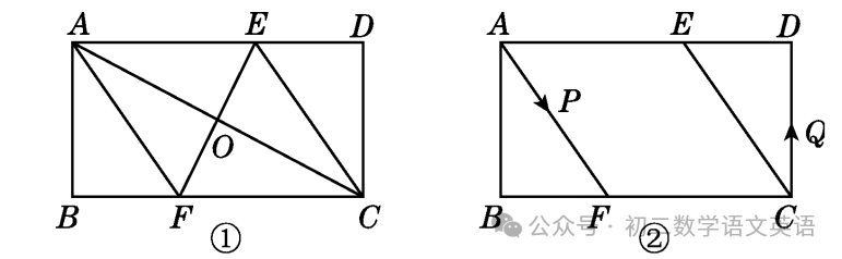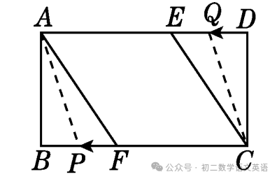 如图,正方形ABCD的边长为8 cm,E,F,G,H分别是AB,BC,CD,DA上的动点,且AE=BF=CG=DH. 初中动点问题(2)判断直线EG是否经过一个定点,并说明理由.如图,连接BD,DE,BG,EG.设EG与BD交于O点.如图,在菱形ABCD中,∠B=60°,动点E在边BC上,动点F在边CD上.(1)如图①,若E是BC的中点,∠AEF=60°,求证:BE=DF;∴AB=BC=CD,∠BCD=180°-∠B=120°.(2)如图②,若∠EAF=60°,求证:△AEF是等边三角形.解: 初中动点问题如图②,连接AC.由(1)知△ABC是等边三角形,如图,在?ABCD中,E,F两点在对角线BD上运动(E,F两点不重合),且保持BE=DF,连接AE,CF.请你猜想AE与CF有怎样的数量关系和位置关系,并对你的猜想加以证明.∵∠AEB+∠AED=∠CFD+∠CFB=180°,已知,在矩形ABCD中,AB=4 cm,BC=8 cm,AC的垂直平分线EF分别交AD,BC于点E,F,垂足为O.(1)如图①,连接AF,CE,试说明四边形AFCE为菱形,并求AF的长;在Rt△ABF中,AB=4 cm,由勾股定理得42+(8-x)2=x2,解得x=5.(2)如图②,动点P,Q分别从A,C两点同时出发,沿△AFB和△CDE各边匀速运动一周.即点P自A→F→B→A停止,点Q自C→D→E→C停止.在运动过程中,已知点P的速度为5 cm/s,点Q的速度为4 cm/s,运动时间为t s,当以A,C,P,Q四点为顶点的四边形是平行四边形时,求t的值.解:显然当P点在AF上,Q点在CD上时,A,C,P,Q四点不可能构成平行四边形;同理P点在AB上,Q点在DE或CE上时,也不可能构成平行四边形.因此只有当P点在BF上,Q点在ED上时,才能构成平行四边形,如图,连接AP,CQ,则以A,C,P,Q四点为顶点的四边形是平行四边形,此时PC=QA.∵点P的速度为5 cm/s,点Q的速度为4 cm/s,运动时间为t s,∴以A,C,P,Q四点为顶点的四边形是平行四边形时,t=4/3.