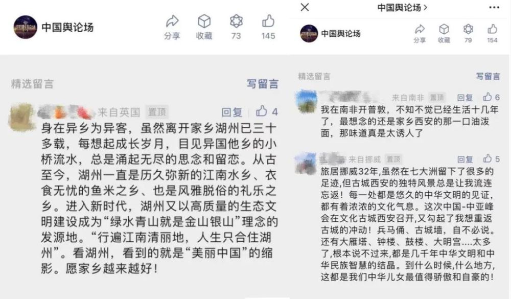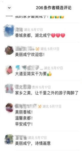众多网友纷纷留言表示,“华夏山河纳祥福,人杰地灵展宏图,千古传!”“倍感温暖亲切”“引以为豪”“循梦而行,向阳而生”,满屏正能量。而更多的留言是“欢迎来到中国黄梅戏之乡安庆听戏品茶”“大美鹤岗,生态优良,这里是东方白鹳的故乡。鹤岗人民欢迎全国各地的朋友来鹤岗打卡旅游”“土暖锅、燕面揉揉、猪血烩豆腐、羊刀炖、搅团……庆阳好吃的风味美食太多啦”“湖水碧波荡漾,候鸟如期而归。早安中国!”等等,字里行间无不洋溢着对家乡的自豪以及广邀海内外朋友到此地一游的好客之情。