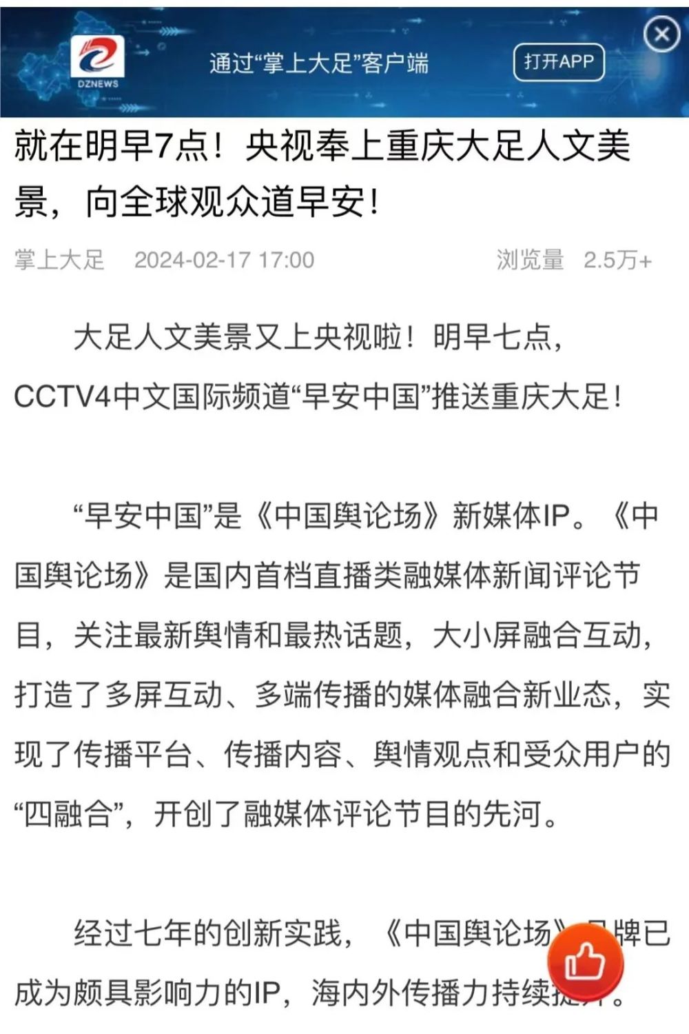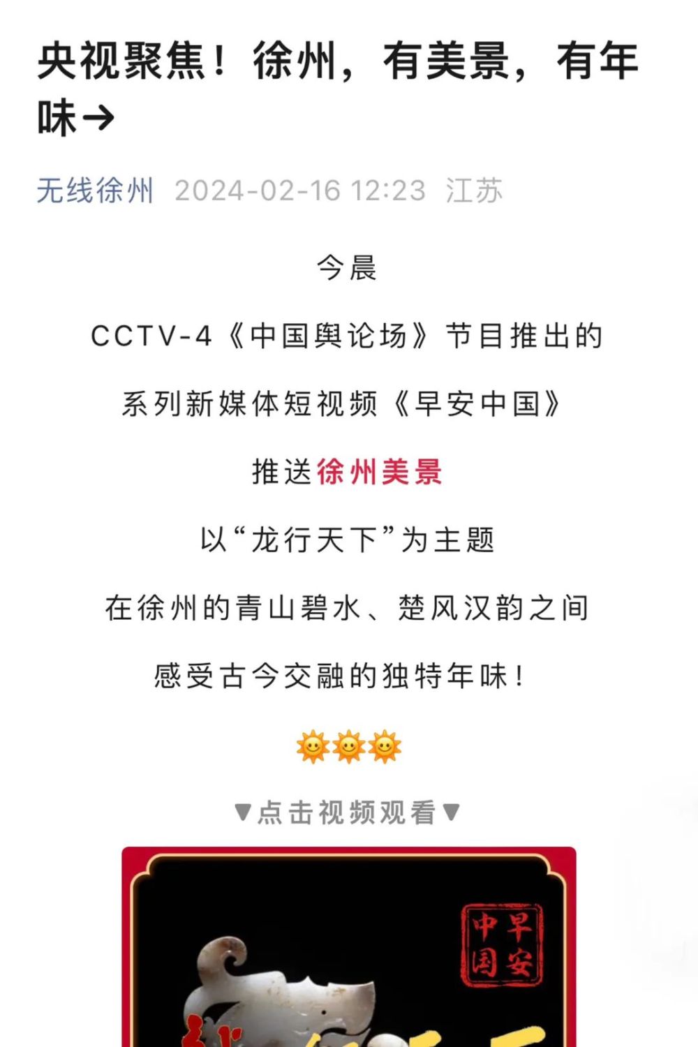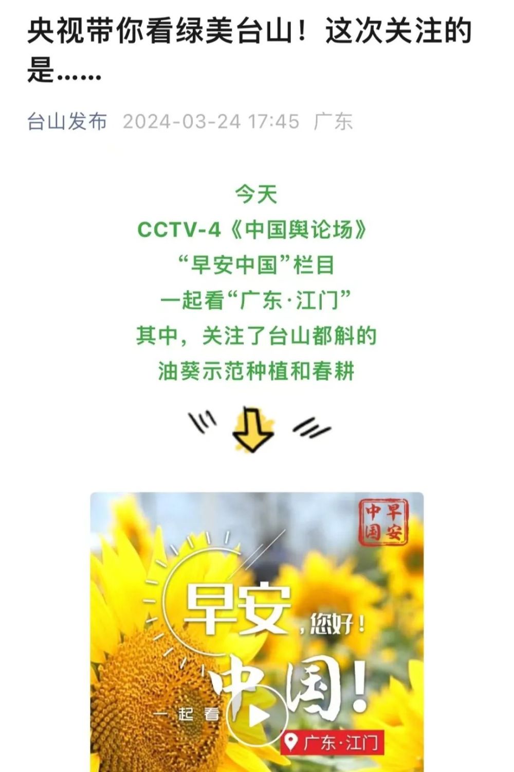 “央视带你看绿美台山,这次关注的是……”“就在明早7点!央视奉上重庆大足人文美景,向全球观众道早安!”“央视聚焦!徐州,有美景,有年味”“金葵向阳开,中春好景和风裁!美丽江门与您相遇央视《早安中国》”……越来越多的地方政府伸出橄榄枝,希望《早安中国》多“来”当地一览好风光。