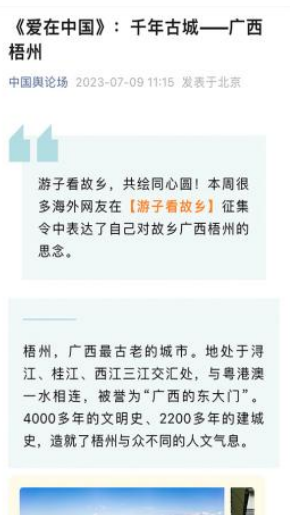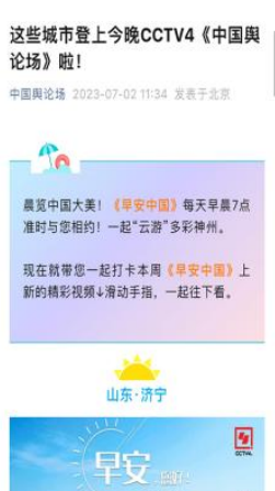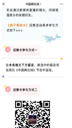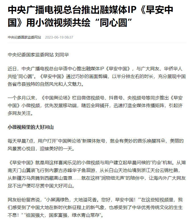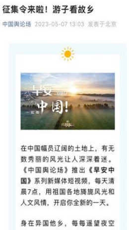 “早安中国切口新颖,有文化属性和微记录的气质。”“每次片尾的结语字幕,都是从哪里选的?每天,都给我学习的机会。”“专业微记录是媒体融合最宽广的路。”……《早安中国》真真切切地缓解了许多海内外网友的故土思乡情切,也收到了来自四面八方的认可及反馈。《中国舆论场》节目持续发出“游子看故乡”征集令,请海外华侨华人说出对家乡的思念和心中最想“打卡”的祖国美景。