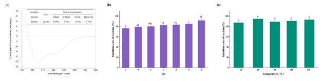 :肽段总数的比较;b:不同分子质量范围的肽段数;c:N-末端氨基酸的相对丰度;d:C-末端氨基酸的相对丰度。e:火山图;f:基因本体和通路分析;g:亚细胞定位;h:蛋白质直系同源群簇;i:京都基因和基因组数据库Pathway-Based富集分析。图2c和图2d显示,马奶酒衍生的AMPs具有典型的多肽特征,具有正电荷、碱性和疏水抗菌活性。圆二色光谱下,MP-4在190~260 nm波长范围内,最大吸收波长为206 nm,呈现明显的负吸收带。在218~225 nm也表现出不显著的负吸收带。206 nm和220 nm附近的双负峰代表了表面AMPs二级结构中的α-螺旋和 张凤梅β-折叠。AMPs MP-4对pH值和热环境敏感性的测定结果表明,MP-4在酸性pH值下表现出良好活性,在碱性pH值下抗菌活性进一步增强。图2 a:AMPs MP-4的远紫外线圆二色谱图;b:AMPs MP-4在不同pH值下抑制率变化;c:AMPs MP-4在不同温度下的抑制率变化鉴定的肽中,通过AMPs数据库中预测肽序列的得分以及对其抗菌活性和稳定性的验证,共鉴定出5 个具有高抗菌潜力的新AMPs。5 种多肽均对金黄色葡萄球菌具有抗菌活性结果显示,最小抑菌浓度(minimum inhibitory concentration,MIC)值为32~512