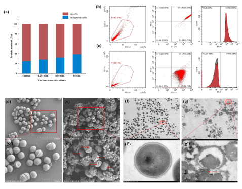 如图3a所示,处理后细胞内蛋白浓度显著高于对照组(未经AMPs MP-4处理)。利用扫描电镜比较MP-4处理后金黄色葡萄球菌表面形态和结构的变化,可以看出,对照组的细菌表面形态完整,结构完整,没有皱纹、凹陷、断裂。采用透射电镜观察AMPs MP-4处理前后细菌超微结构的变化。在没有AMPs ?MP-4处理的情况下,细菌细胞结构完整,细胞膜清晰可见。a:MP-4对金黄色葡萄球菌培养物中蛋白质含量百分比的影响;b:未经MP-4处理的金黄色葡萄球菌细胞流式图;c:MP-4处理金黄色葡萄球菌2 ?h的流式图;d:未经MP-4处理的金黄色葡萄球菌的扫描电镜图;e:用MP-4处理金黄色葡萄球菌的扫描电镜照片;f:未经MP-4处理的金黄色葡萄球菌的透射电子显微镜照片;g:经MP-4处理的金黄色葡萄球菌的透射电镜图。a'、b'、c'、d'依次为a、b、c、d的放大图。