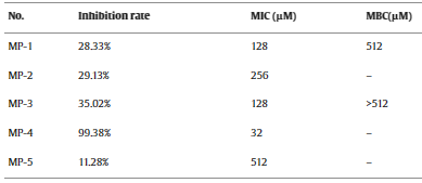 μmol/L。AMPs MP-4对金黄色葡萄球菌的MIC为32 μmol/L,最小杀菌浓度(minimum bactericidal concentration,MBC)为128