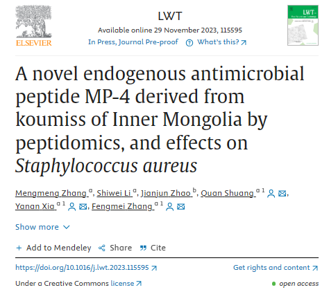 文章《A novel endogenous antimicrobial peptide MP-4 derived from koumiss of Inner Mongolia by peptidomics, and effects on Staphylococcus aureus》发表于LWT 2023年11月29日内蒙古农业大学食品科学与工程学院双全教授、夏亚男副教授、张凤梅副教授为本文共同通信作者文章链接:https://doi.org/10.1016/j.lwt.2023.115595