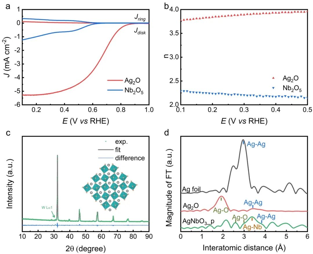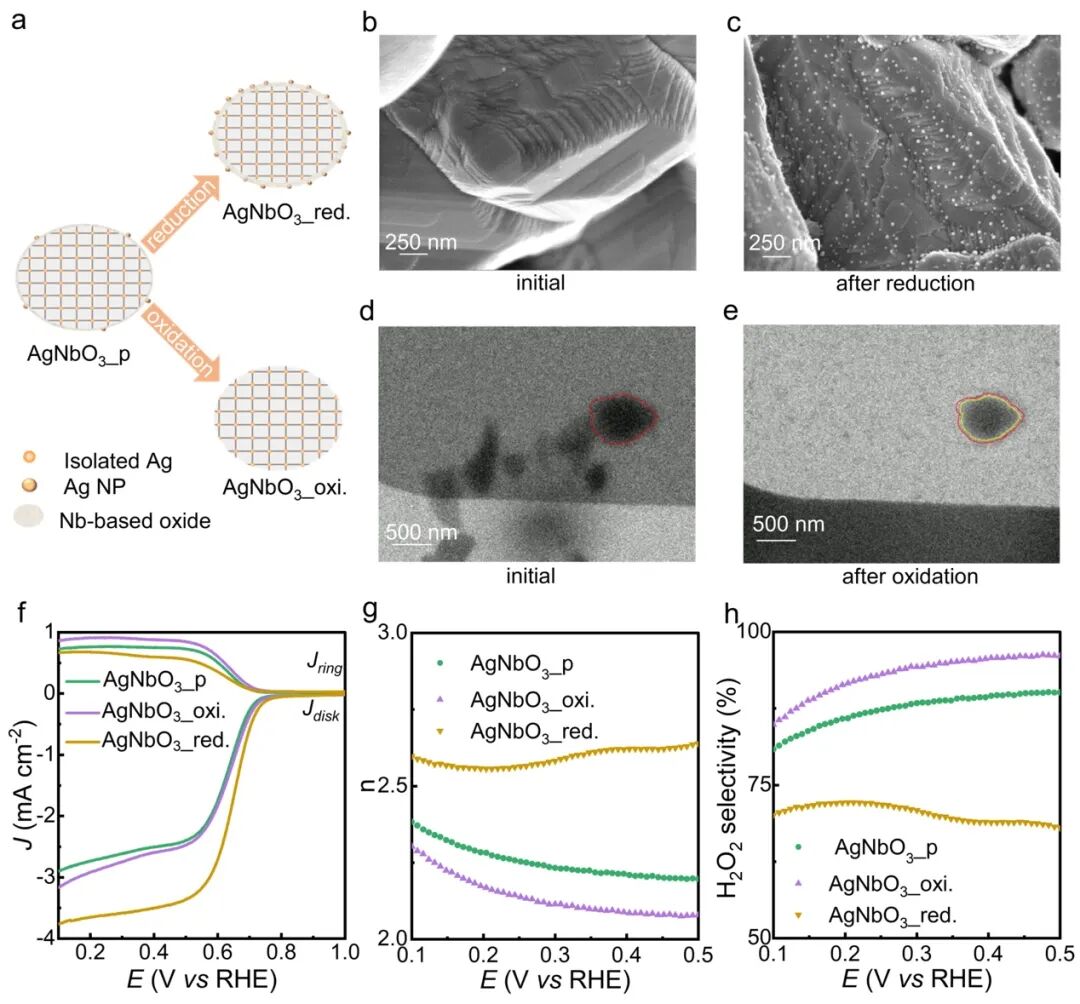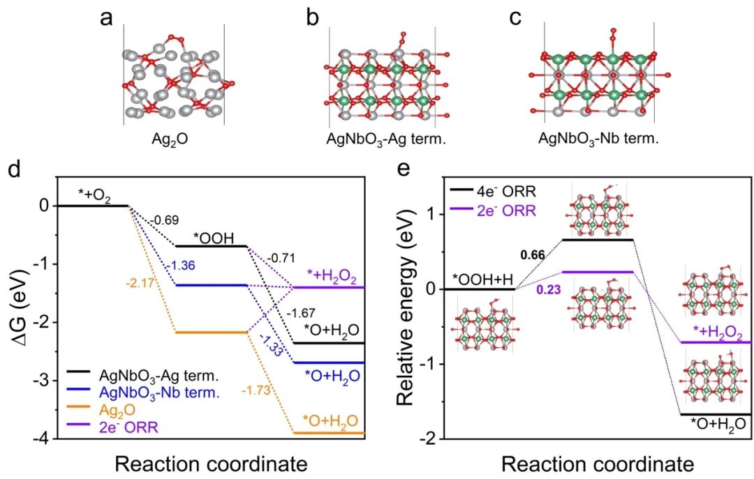 2024年5月1日,相关成果“Isolated active sites in perovskite lattice for efficient production of hydrogen peroxide”发表于Matter期刊。论文通讯作者是黄海涛教授,第一作者是陈高博士。具有孤立活性位点的催化剂在电催化选择性2电子转移氧还原合成双氧水中显示出优异的活性和选择性。这是因为孤立活性位点倾向于以Pauling的吸附构型吸附氧气分子,使得在氧还原过程中维持O-O单键。理论上而言,A位限域的钙钛矿晶格(A位可视为被B-O组成的八面体原子级别地孤立于钙钛矿晶格中)符合构筑孤立活性位点用于电催化氧还原选择性合成双氧水的条件,但该假设尚缺乏科学论证。此外,钙钛矿表面通常偏离理想的结构,为正确地关联钙钛矿结构与氧还原反应的构效关系带来了巨大的挑战。这项工作以AgNbO3钙钛矿为模型验证该假设。在AgNbO3体相中,Ag被Nb-O组成的八面体原子级别地孤立于钙钛矿晶格中,但是其表面通常是A位富集的状态(Ag纳米颗粒)。采用电化学氧化方法拆解除去钙钛矿表面的非理想结构,使得钙钛矿结构的AgNbO3晶格得以暴露,该过程被原位液相电化学透射电子显微镜(TEM)揭示。电化学测试结果表明,新鲜暴露的AgNbO3钙钛矿晶格对氧还原产双氧水表现出高达96%的选择性,在电解槽250 mA大电流下稳定运行72小时。结合第一性原理计算和原位拉曼、红外光谱技术,确定了AgNbO3中孤立的Ag位点是选择性产双氧水的活性位点。1. AgNbO3的组成元素Ag和Nb对应的氧化物Ag2O和Nb2O5分别是4e- ORR活性和惰性的;2. AgNbO3钙钛矿中Ag-Ag距离大于O2分子动力学直径。AgNbO3钙钛矿中Ag位点有利于O2的Pauling-type吸附以及2e-转移ORR路径。图3:三组AgNbO3样品的表面物种和ORR活性。原始AgNbO3钙钛矿(AgNbO3_p)表面有小部分Ag纳米颗粒,还原处理的AgNbO3钙钛矿(AgNbO3_red.)表面有很密集的Ag纳米颗粒,电化学氧化处理的AgNbO3钙钛矿(AgNbO3_oxi.)表面非理想结构被除去,暴露新鲜的钙钛矿晶格(由原位液相TEM揭示)。电化学测试表明Ag纳米颗粒和AgNbO3中孤立的Ag位点分别驱动4e-和2e-ORR过程。图4:原位拉曼和红外光谱揭示ORR过程中AgNbO3的结构变化和反应机理。 黄海涛该项工作为钙钛矿用于构筑孤立活性位点的平台提供了关键的科学支撑,加深了对钙钛矿结构的认知,丰富了孤立活性位点催化剂的种类。该策略有望拓展至其它化学品的绿色靶向合成。原文链接