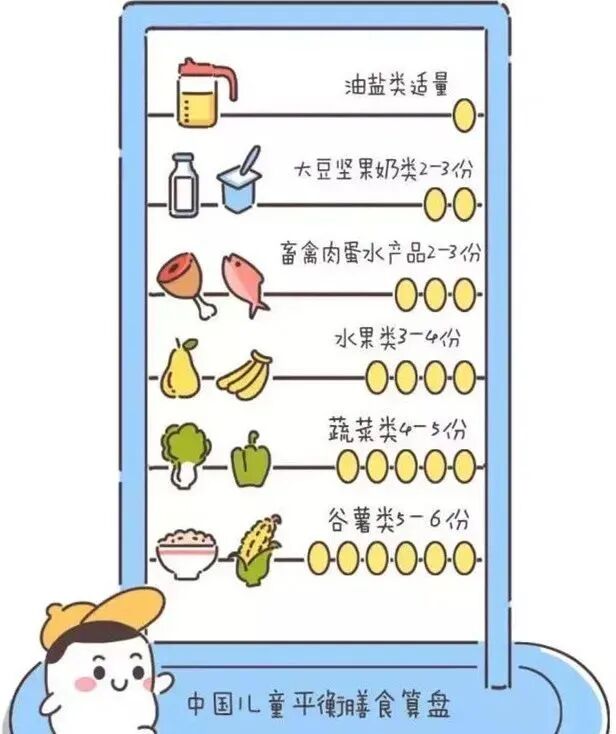 保证孩子的营养全面均衡,爸爸妈妈需要注重不同年龄段的膳食平衡,确保每日的所需能力充足。牛奶肉类补优质蛋白和矿物质,蔬菜水果补维生素和膳食纤维,米饭补碳水化合物,这些都是孩子生长发育需要的营养。俗话说,吃得丰富才是王道。那怎么样才算丰富呢?“小份量”就是一个很好的选择。同等能量的一份午餐,选用“小份”的菜就能增加食物的种类,孩子就能吃的更丰富,营养更全面。《中国居民膳食指南》给出的中国儿童平衡膳食算盘中,从份数上看,以淀粉为主的谷薯类占比不到30% 。如果不知道怎样吃才算丰富,可以参考中国儿童平衡膳食算盘(如图)。