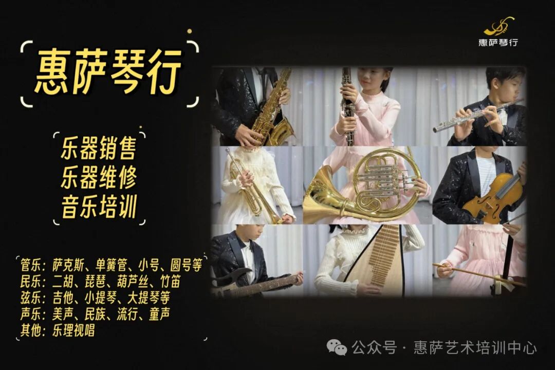 我们的专业培训课程有:钢琴、小提琴、大提琴、吉他、尤克里里、长笛、萨克斯、小号、巴松(大管)、电吹管、圆号、大号、单簧管、古筝、琵琶、唢呐、二胡、竹笛、葫芦丝 、箫、声乐(美声、民族、通俗、童声)高考乐理、视唱练耳等等培训课程。我们的专业服务有:乐器维修、打谱、作曲、编曲、后期制作、录音、录歌、视频制作等!我们琴行最近还推出淘宝线上乐器销售哦!需要购买乐器的亲,可以直接上淘宝网搜索店铺“惠萨琴行”买上你喜欢的乐器吧!!!(收藏店铺有优惠哦!)惠萨艺术培训中心各专业常年招生,随报随学,同招少儿和成人!欢迎各位家长带孩子前来咨询试听!