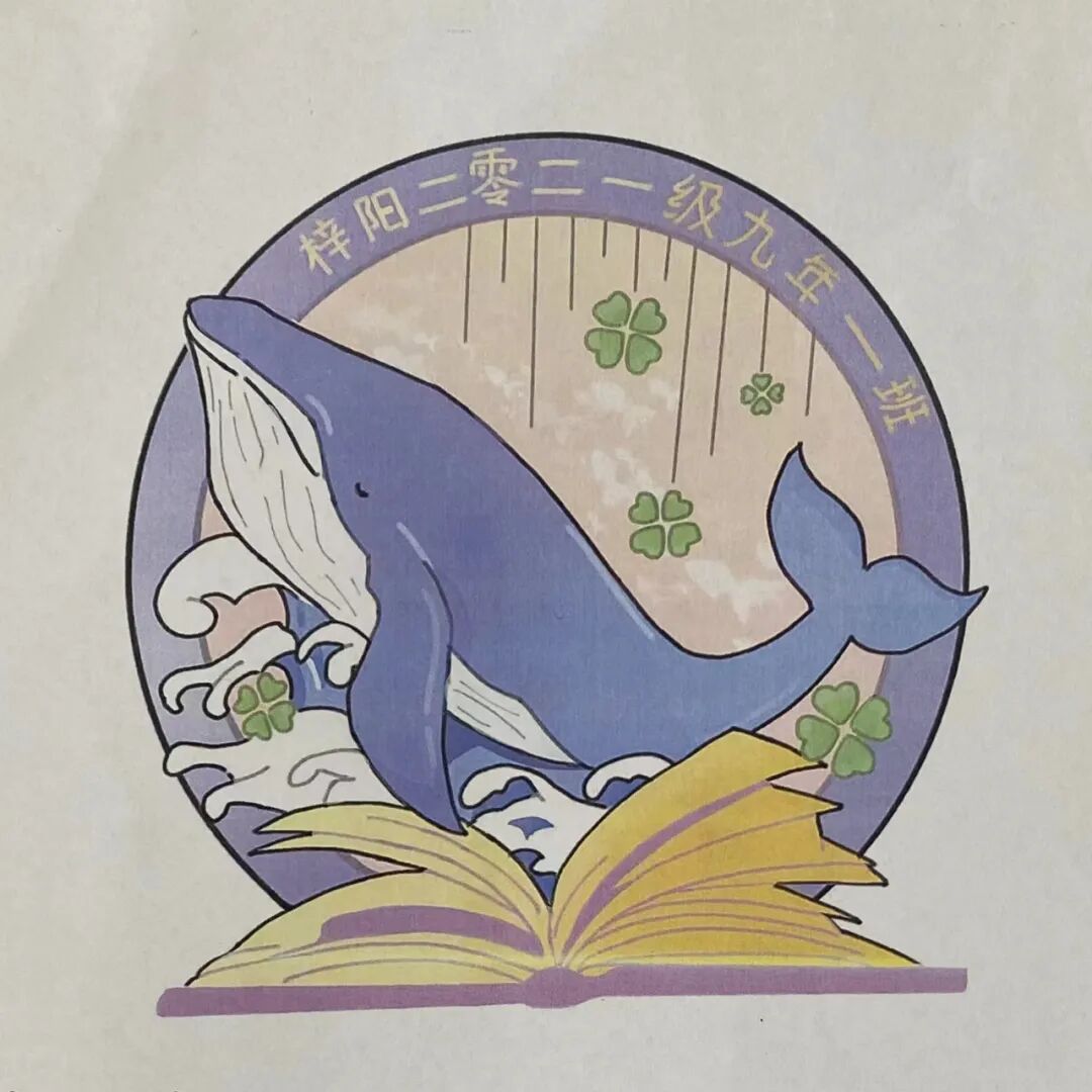 设计理念:班徽中,鲸鱼的设计成闭眼状态,因为它正在享受知识的海洋;四叶草的设计是来源于班级名,加入四叶草作为班级的特征;书本的设计是打开的,希望同学们可以在知识的海洋中自由遨游,探讨这片海洋中的奥秘。