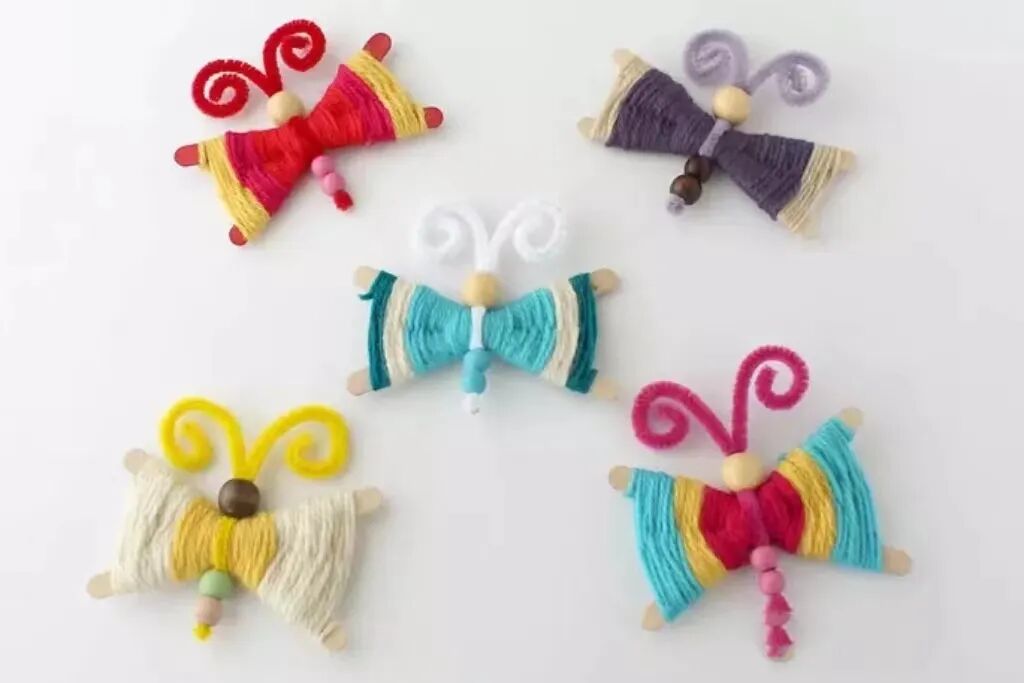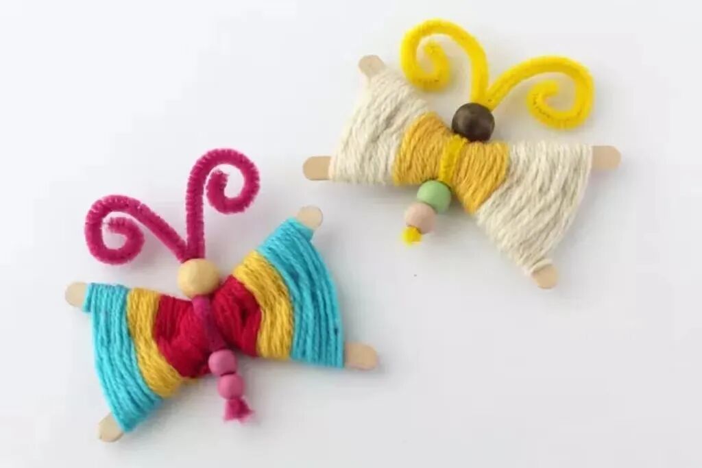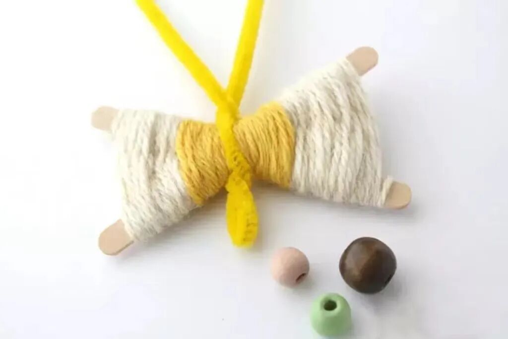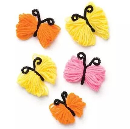 简易版小蝴蝶:将团好的毛线用毛根固定起来,然后在顶部扭曲成触角的样子,就可以做出一个小蝴蝶了。
