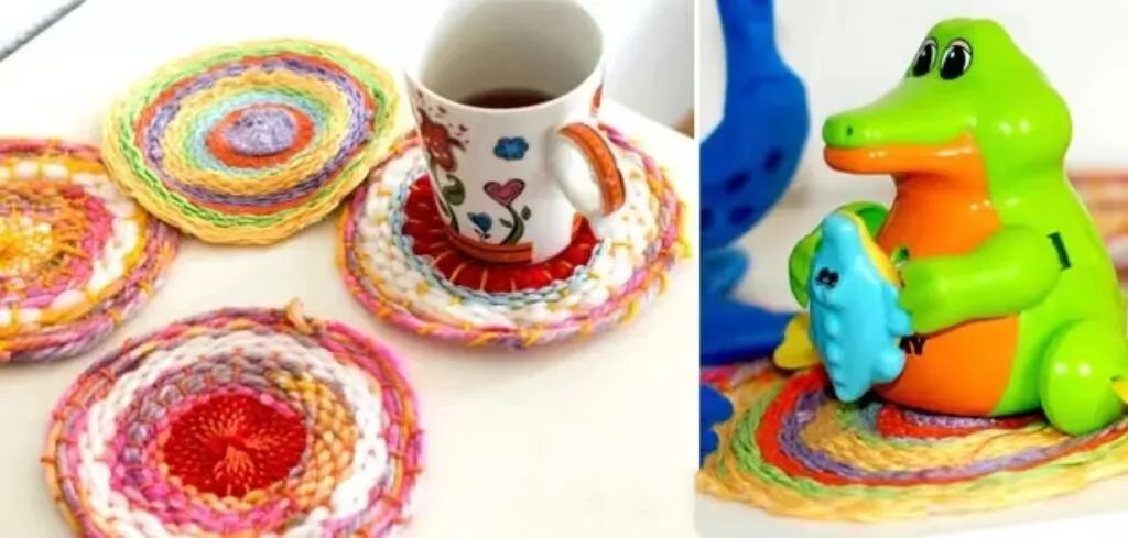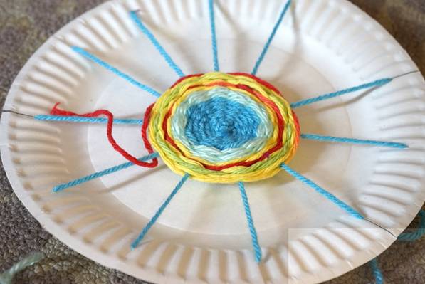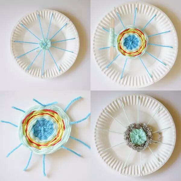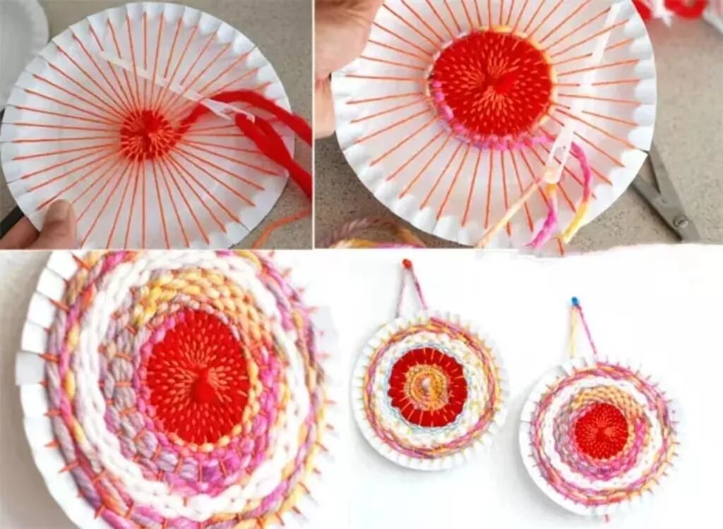 除了手链和杯垫外,用同样的手法还可以编织出更加美观的工艺品,像彩虹纸盘,颜色鲜艳、触感温柔,孩子们的心情也会随之变好。