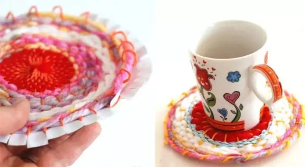 当整个纸盘都被美丽的毛线覆盖好的时候,一个简单的纸盘就变成一个编织好的杯垫了。(记得多余的纸盘边缘要剪掉)