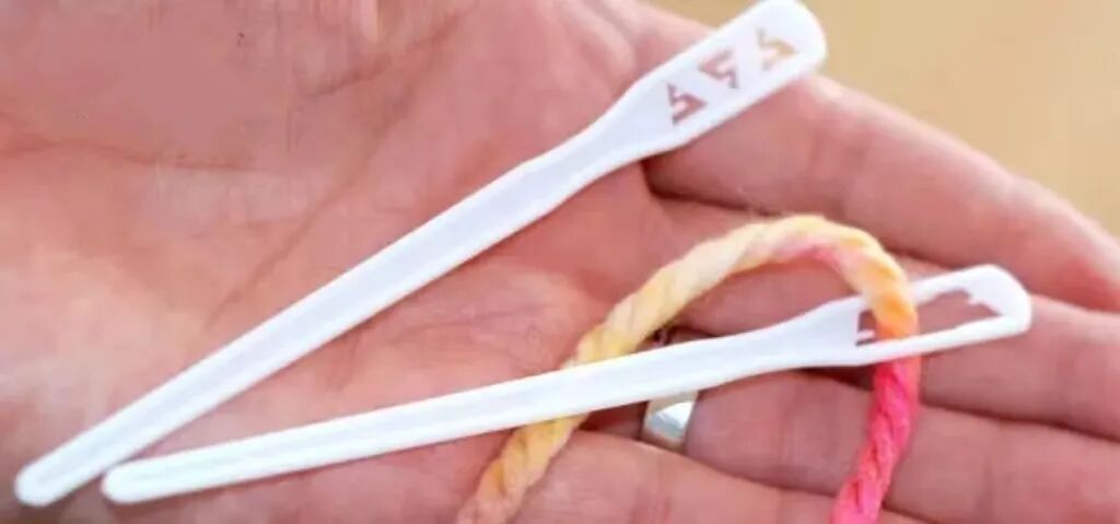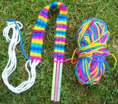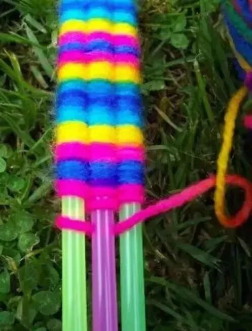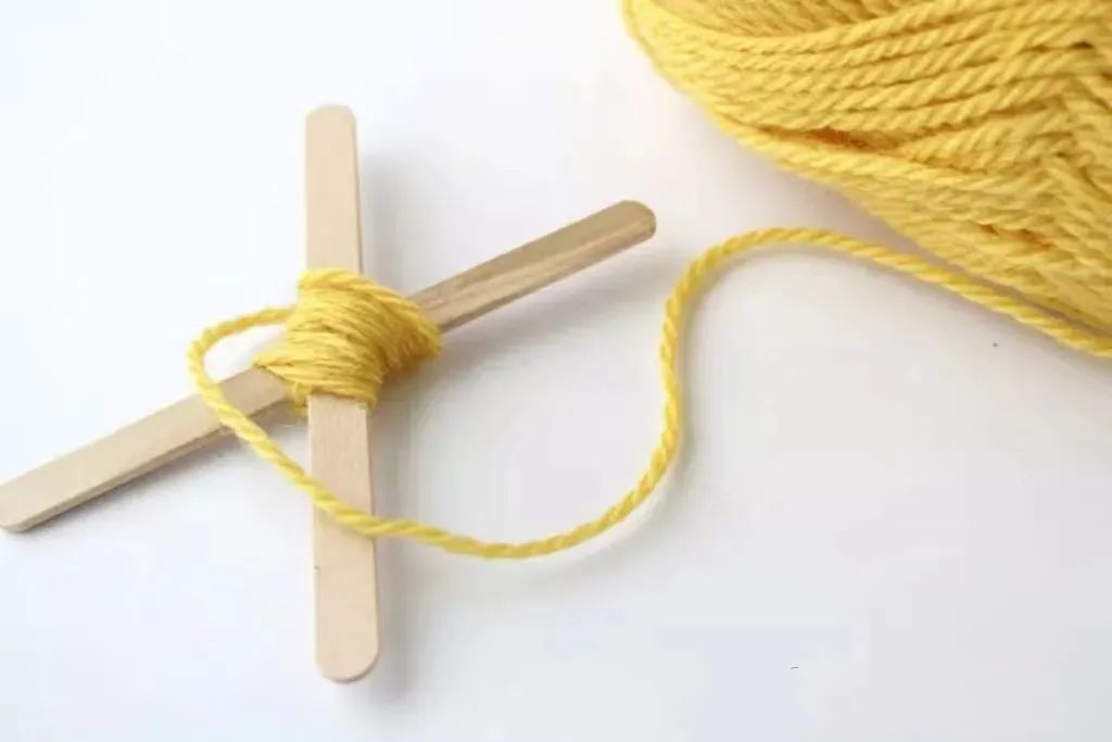 第二步:将毛线捆绑在冰棒棍上,用冰棒棍充当针头,带着毛线上下穿行编织。