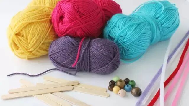 准备材料:毛线、两根冰棒棍、小串珠、毛根。
