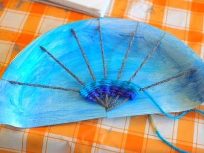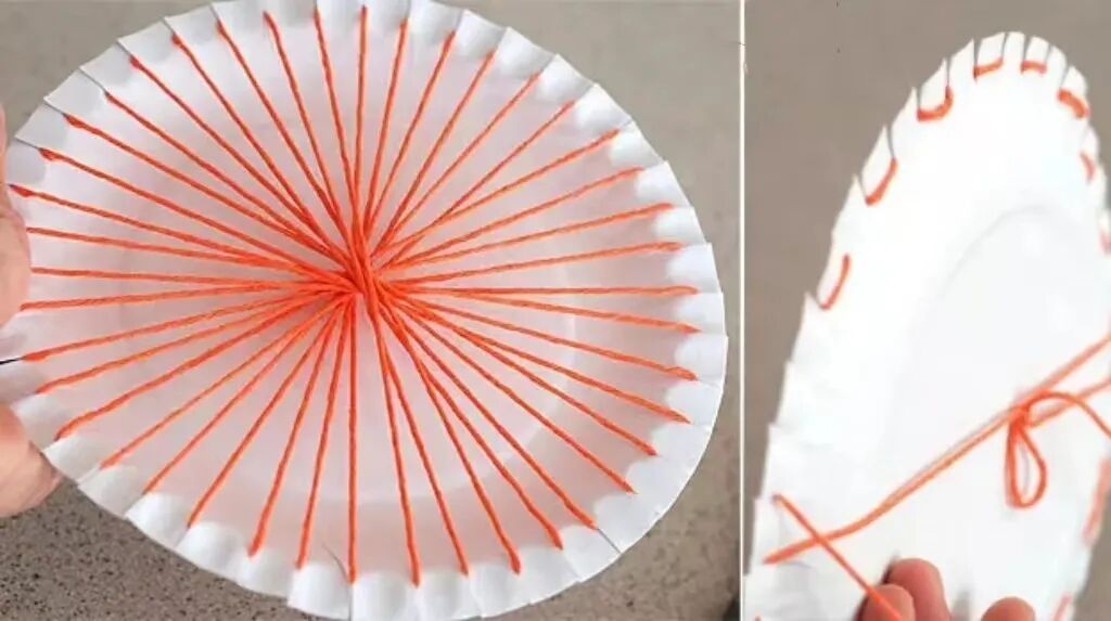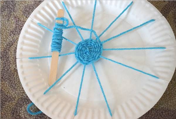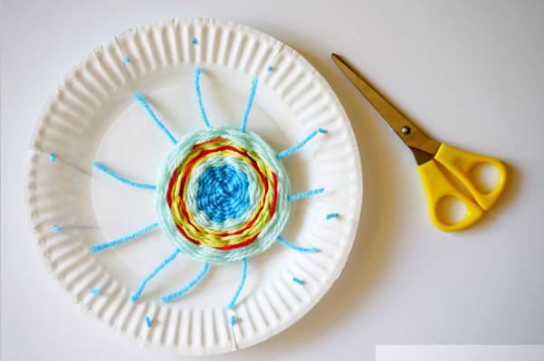 准备材料:纸盘、剪刀、毛线、儿童针。