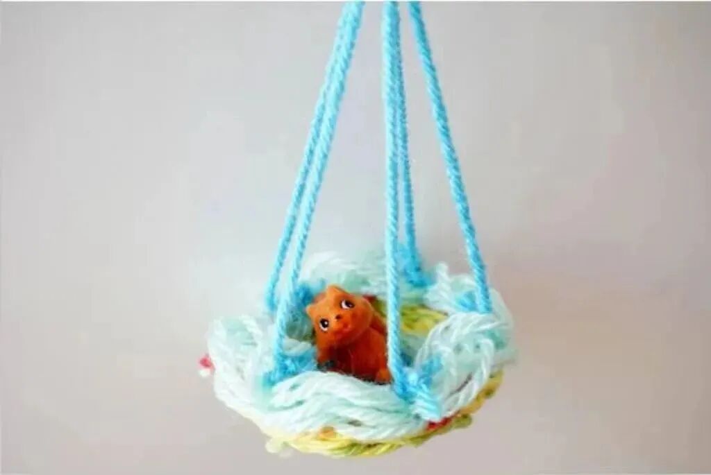第四步:将外围的毛线聚合在一起,就可以看到一个漂亮可爱的小吊盘了,孩子们可以把一些比较小巧的玩具放在吊盘中。