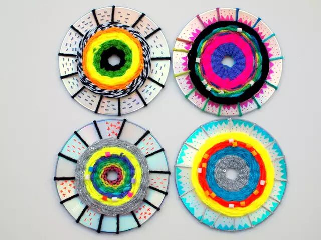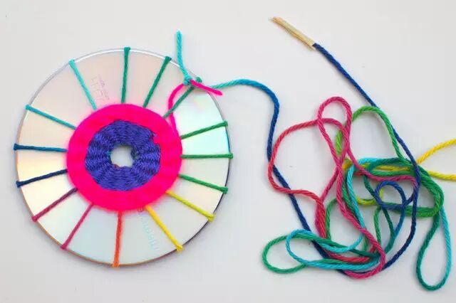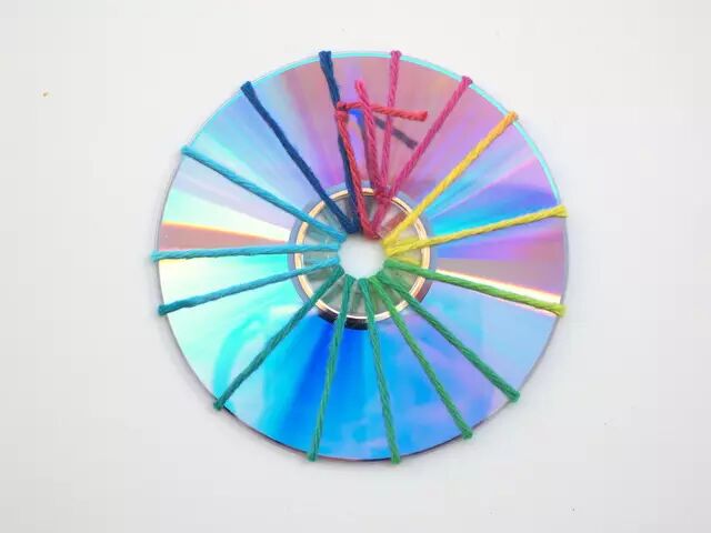 第三步:当编织工作完成后,用水彩笔为光盘剩余的边缘部分上色,让剩余的反光部分变得更加绚丽可爱。