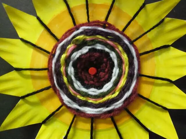杯垫大变身——新版梵高的向日葵:用同样的编织原理,加上纸盘的裁剪、绘画、调色,还可以编织出美丽的向日葵。是不是跟梵高的向日葵还有几分相似呢?