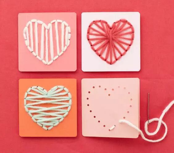 桃心大不同:如图,在硬纸板上打孔,绘制成一个心形图案,用儿童针带着毛线,以不同的形式穿插、编制,就可以绘制出不同感觉的小桃心。