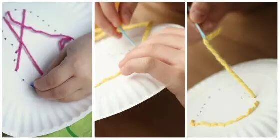 第二步:用儿童针带着毛线从小孔中以不同的形式穿过。穿引的过程中可以给孩子们更多的自由性和想象空间,制作过程不用受限。