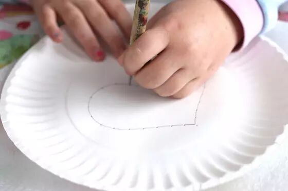 第一步:需要先用笔在盘底绘制一颗桃心,然后打孔。