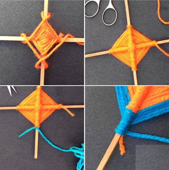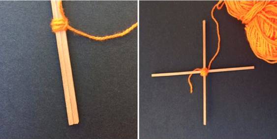 第一步:先把两根冰棒棍交叉成一个不规则的“X”形,用毛线在交叉点固定缠绕。(教师巡回指导)