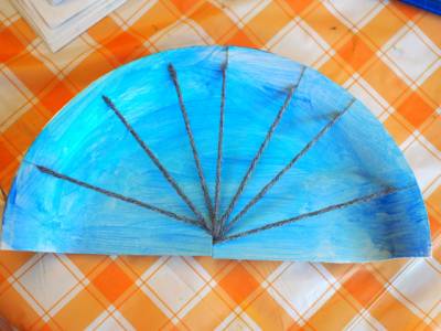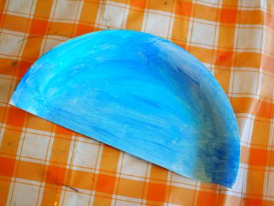 第一步:在纸盘上涂上浅蓝色作为天空,当然还可以绘制云朵作为背景。