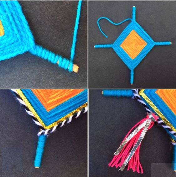 第三步:最后是边缘的固定和加上一些小装饰,记得多余出来的小棍儿也要用线团缠绕好。