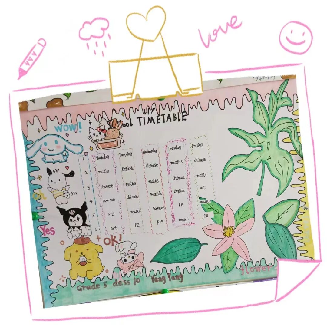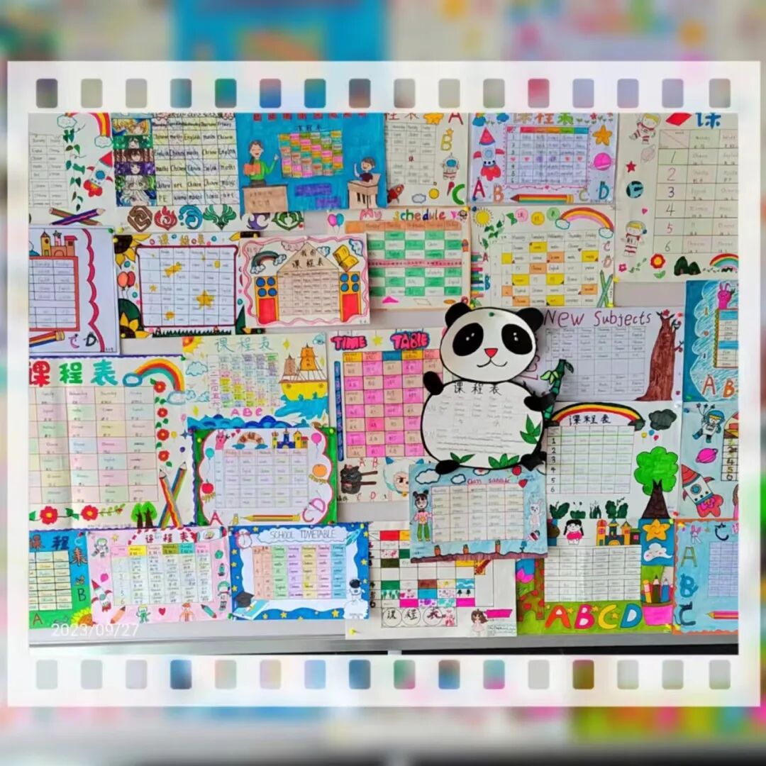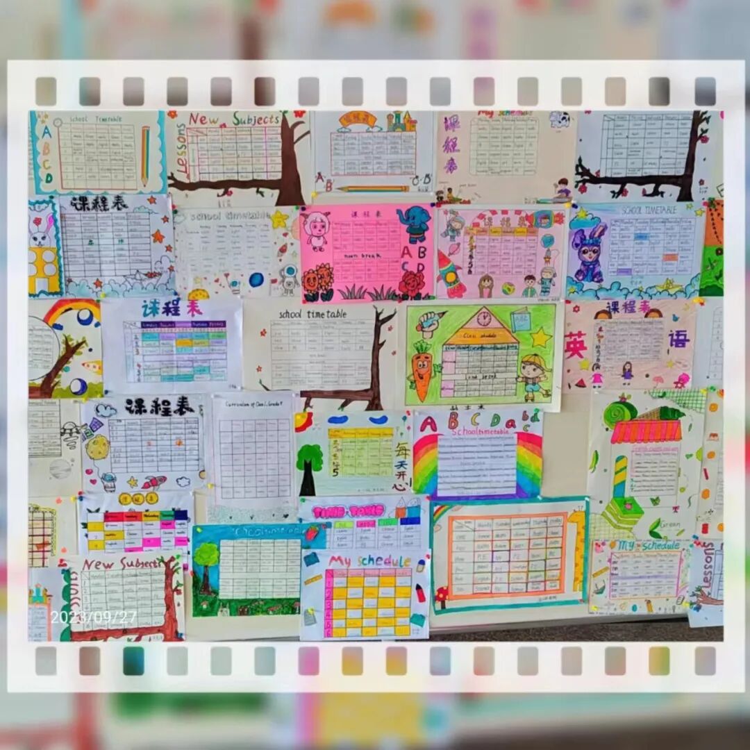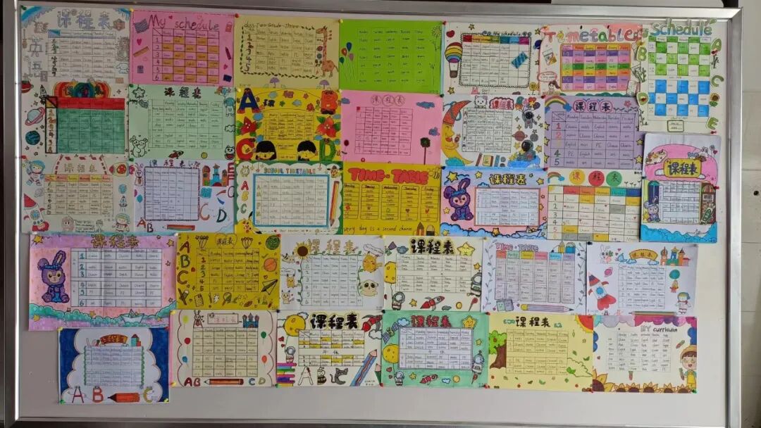 学生们通过收集资料,动手设计制作,融合多种元素,绘制出一张张主题突出、色彩明快、各具特色的英语课程表手抄报。孩子们体会到了学英语、用英语的快乐,并形成了良好的英语书写规范。