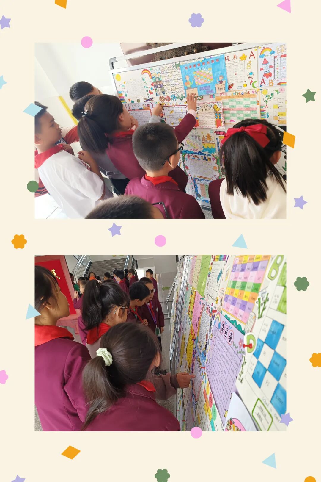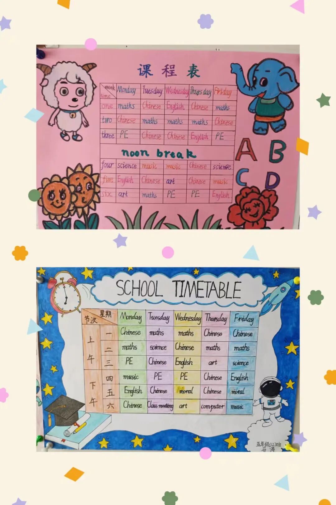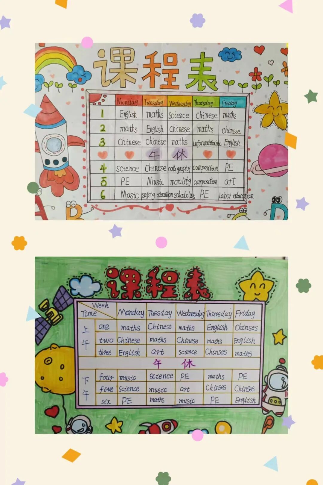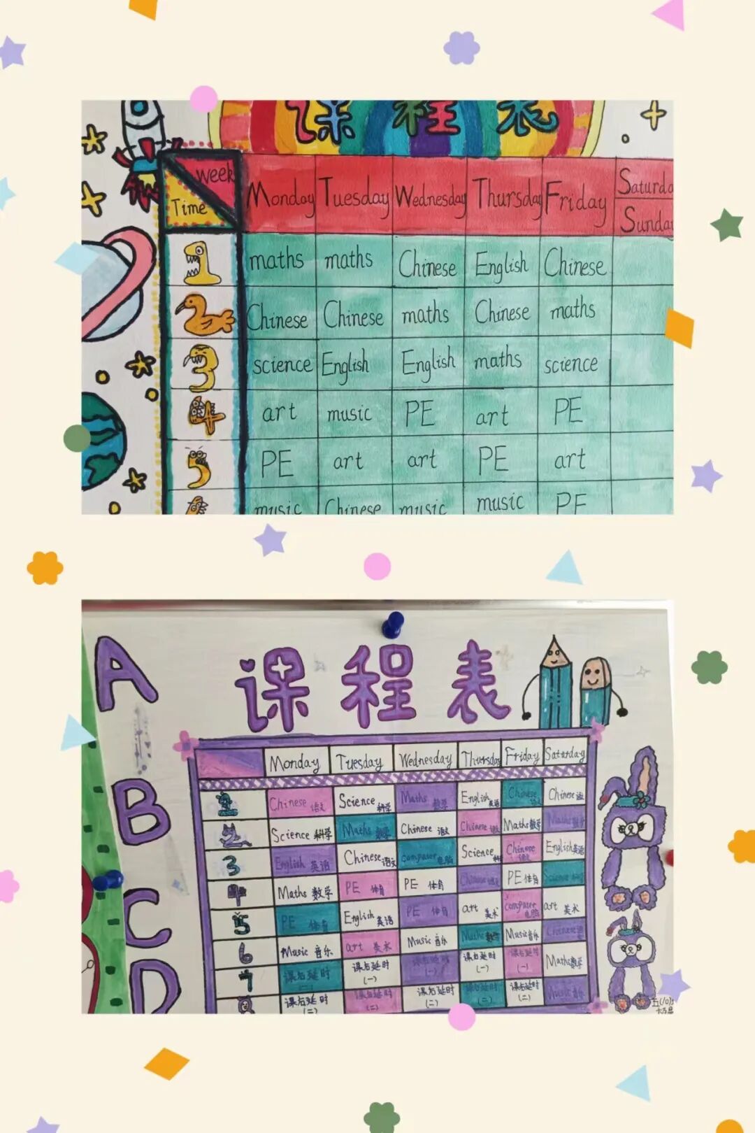 学生们通过收集资料,动手设计制作,融合多种元素,绘制出一张张主题突出、色彩明快、各具特色的英语课程表手抄报。孩子们体会到了学英语、用英语的快乐,并形成了良好的英语书写规范。