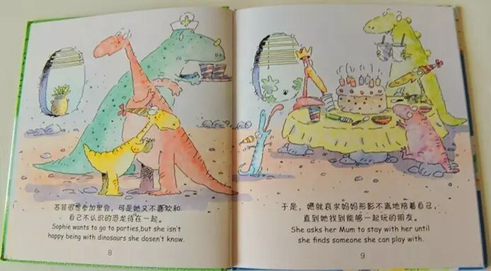 Sophie wants to go to parties,but she isn't happy being with dinosaurs she dosen't know.