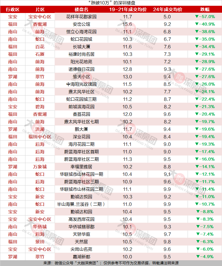 花样年花郡的成交均价,从11.7万元/㎡下跌至5.0万元/㎡,经历了夸张的57%的跌幅,早已是宝中著名的网红盘。成交均价下跌第二的小区,是福田香蜜湖片区的安峦公馆,成交均价从15.6万元/㎡下跌至9.2万元/㎡,跌幅达到40.9%。南山区跌幅最高的是前海片区的恒立心海湾花园,成交均价从11.1万元/㎡下跌至6.8万元/㎡。罗湖区跌幅最高的是翠竹的愉天小区,成交均价从13.0万元/㎡下跌至9.4万元/㎡。