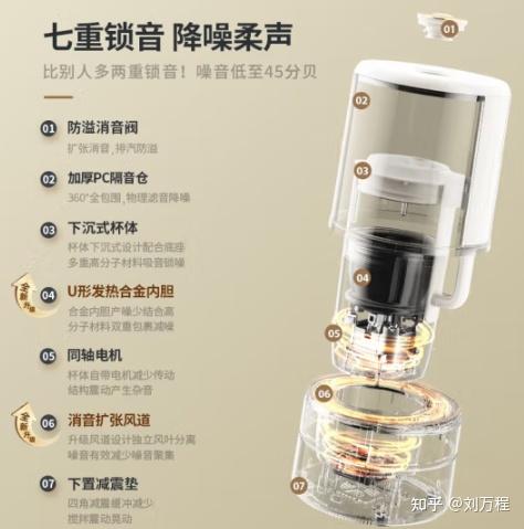 这款机器在使用时声音低至50db,采用七重降噪技术,加厚PC隔音仓包围搭配消音扩张风道减少了噪音的剧集,内部为同轴电机,还将内胆升级为U型发热合金,用料相当扎实。