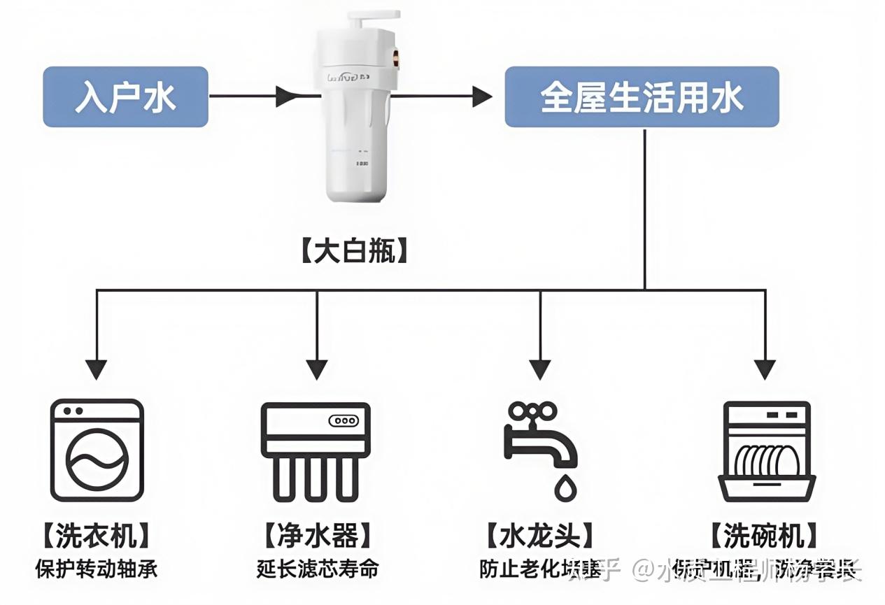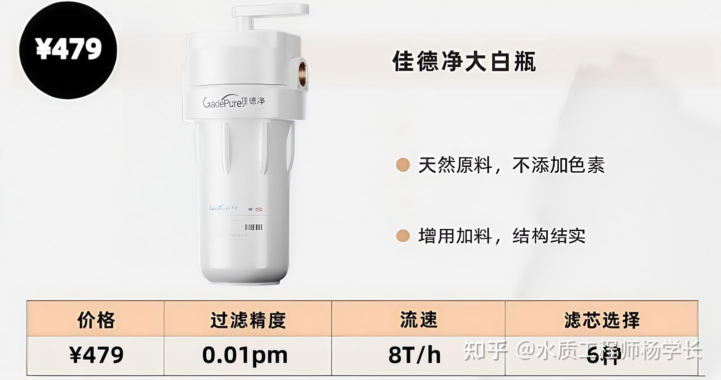 首先,澄清一个基本概念:大白瓶并不是智商税!!! 它确实能够过滤掉自来水中的部分杂质、铁锈、悬浮物等等…… 特别是停水再恢复、管道老旧、水质偏差的的地方,每次家里一打开水龙头出的水简直又黄又浑浊,实在是看不下去,想想这样的水喝下去或者接触到皮肤是真的很恶心 所以这时候,作为新概念大白瓶,就成了许多人改善水质的第一选择,但大家又怕踩坑 作为水质工程师,任职5年内,光净水方案就给100+户设计过! 不懂、不了解或者正在纠结的各位家装亦菲彦祖们,今天我就花1分钟,给你们把大白瓶讲透、讲明白,绝不踩坑! 前置大白瓶能起到什么作用,主要取决于瓶里放置滤芯的种类,大胖滤瓶就是一个空的壳体,放置不同的滤芯过滤效果也就不同。 可以达到1~25微米过滤精度的高效前置过滤器,有效过滤铁锈、泥沙等大颗粒杂质 这样的滤芯就可以吸附水中余氯、异味,相当于中央净水机的吸附效果,优点在于便宜,即使并联也只用花500~1000,而中央净水光一台的价格就得上万! PP棉滤芯能去除水中铁锈/泥沙/红虫/胶体等大体积的物质,降低水的浊度; RCF滤芯发挥吸附余氯/异味/异色的作用,最后BBC还能抑制细菌滋生,重金属等等,并改善水的口感 所以,论净水效果以及安全性的话,肯定三联最有保障! 标准出厂的自来水在漫长的管道运输中,易遭到二次污染含泥沙,铁锈等大颗粒杂质。 时间久了机洗衣服容易发黄,下厨洗菜出水浑浊,沐浴过水花洒堵塞,热水器流量变小…… 大白瓶作为全屋净水首道防线,既要从源头保障家人用水健康,还要延长家用涉水电器寿命,把关家庭全屋用水 所以,不关你是新房装修、老房改造,还是租房提升用水质量,大白瓶都必不可少 大白瓶对水压的影响,主要要看滤芯和水质情况,通常对水压的影响在0.1-0.2kg,只要全屋入户水压不低于2.5kg就感觉不到影响 所以说影不影响水压要看入户水压多少和自己选择的花洒、智能马桶等对水压的要求,需要综合来判断。 大白瓶的1寸进出水口并不小于大多数商品房的入户管径,因此不会限制水流量。 水流量主要由入户管路中最细的部分决定,如4分的管径水流量约为1.8吨,6分的管径约为2.8吨,1寸的管径约为3.8吨。 而大白瓶的1寸口径没有显著影响水流量,这个也基本上可以忽略! ? 看流量 一般选择流量 4-5T/H小于 4T,水流量太小,无法满足家庭用水需求,大于 4T的话,水流量大,出水多,家庭用水绰绰有余 ? 看质量 ? 看截留率 也就是大白瓶前置过滤器能拦截杂质的效率,一般截留率肯定是越大越好。 截留率主要看滤芯的孔径和材质,PP棉的过滤精度越小,净水器的截留率越高。 其实,看了前半 大白瓶部分的内容,大家已经可以自主去挑选了,但考虑到大白瓶作为长期使用的产品,其品质和效果只有真正使用后才能有切身体会。 所以,为了帮助大家更直观地了什么大白瓶既靠谱又好用,我特地挑选了一款大白瓶安装在家中,并记录了两个月的真实感受,大家也可以参考一下 这两月测下来,佳德净大白瓶给我的感受就像是一款mini全屋净水滤瓶,体积小巧,特别适用于像我家住的高层小空间商户公寓: 安装灵活,厨下空间有限的,可以像我一样直接贴在墙壁上,还不用插电,用着也很方便。 而且相比市场上很多净水设备安装过后会减小水流的现象 我买的这款佳德净大白瓶用的是一寸管径的10寸大滤芯,还并联了PP滤芯+复合滤芯,水流丝毫也没有减小的迹象,算是真正做到了过滤不减压。 后续换芯成本也是难以相信的便宜: 买得起更用得起,换芯一点都不心疼,这价格放其他家对比起来,非常良心。 官方给的过滤精度是:0.01μm 我自己的直观感受是,家里的水质的的确确是变好了,也不像原来那样泛黄、有异味,家里的烧壶水、洗衣机里面水垢水碱都少了好多 还记得有一回出门走亲戚两三天回来,打开水龙头也没发现有浑浊水,杂质水的现象 而且就算烧开了,喝着也没一点异味,口感还比原先好了不少,甜丝丝的 家里小孩现在放凉后也愿意多喝两口了~ 目前已经用了两个月了,过滤后的水TDS值依旧稳定在110左右,就跟市政新装水管的TDS值差不多,出水量也丝毫没变小,家里不管是洗澡、洗漱、接水一直都非常畅快! 期间还问了下客服,30天无理由退换,48小时人员上门且无隐形收费,一年内只换不修,还有5年的质保,说实话售后能做到这份上确实太到位了! 整体而言,佳德净家的大白瓶不管是品质还是过滤效果都非常全面,在业内也是出了名的卷价格+钻技术,把明星代言的钱都花在了刀刃上 从大白瓶本身到后续的换芯滤芯都很卷,把高端瓶的品质做到了中端瓶的价格! 最近他家还有国补和店铺优惠,单瓶到手不到500的前提下,下单还送3根PP滤芯,以及享受后续换芯8折优惠,属实非常良心了! 最后,大家如果还有什么净水相关的问题,不懂的,不了解的,也欢迎私信或者在评论区留言,下一期我会整合并单独写一篇相关回答~