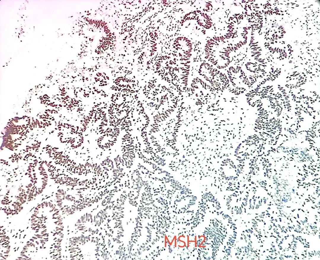 成就健康的力量 精医 诚信 至爱 利民 本月起,错配修复(MMR)系统正式入驻建三江医院病理科,成为免疫组化家族新成员,并且以其独特的检测优势成功应用于结肠癌患者的病理诊断及预后判断中。 什么是MMR? MMR系统广泛存在于生物体中,可校正DNA重组和复制过程中产生的碱基错配而保持基因组的稳定性。包括MutS和MtuL两大家族,其中MLH1、MSH2、MSH6、PMS2是MMR的主导蛋白。 MMR检测方案 免疫组化检测错配修复蛋白是目前最广泛可行的d-MMR检测方法,这种检测方法简单易行,价格低廉。使用MLH1、MSH2、MSH6、PMS2四种抗体。 如何判读MMR? MLH1、MSH2、MSH6、PMS2这4种主要的MMR蛋白的免疫阳性反应均位于细胞核中,若细胞核内出现清晰的黄色或棕黄色染色颗粒则判定为阳性染色。全部阳性则判定为错配修复基因完整(pMMR),其中的≥1种表达缺失判定为错配修复基因缺陷(dMMR)。 为什么要检测MMR? 筛查患者是否潜在患有Lynch综合征 Lynch综合征是一种常染色体显性遗传性癌症综合征,其特点是在编码四种错配修复蛋白的基因中发生胚系突变。它是遗传性结直肠癌的最常见原因,约占结直肠癌的3%。受影响的患者结直肠癌、子宫内膜癌、卵巢癌、胃癌等肿瘤的发病率明显增加。准确识别患有Lynch综合征的患者有助于通过早期诊断和癌症监测来降低风险,改善患者和家庭的预后。 预测对PD-1免疫检查点抑制剂的反应 检测d-MMR或MSI-H可以识别对PD-1抑制有反应的患者。在2022年中国临床肿瘤学会(CSCO)胃癌诊疗指南中,提出在胃癌组织中评估MSI/dMMR状态,是I级推荐。 作为预后生物标志物 评估d-MMR或MSI-H能够较好地判断肿瘤患者的预后。以结直肠癌为例,d-MMR与3期结直肠癌复发后患者的生存密切相关。此外,研究表明,与p-MMR肿瘤相比,d-MMR结直肠癌在分期调整后的生存率更有利。 我们振奋精神 服务您的健康 编辑 / 张 瑞 审核 / 马婷茹 张晓斌![]()
