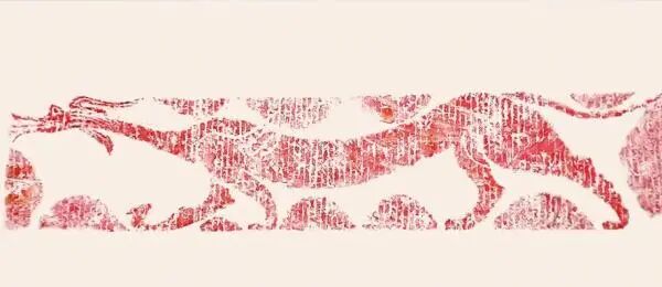 《四神云气图》壁画以朱砂红为底色,用白、绿、黑等颜色描绘了各种神禽异兽和吉祥图案。其中,一条巨龙尤为引人注目,它呈“S”形弯曲,占据了画面的中央,龙身长约7.5米。龙舌卷住了一个怪兽的尾部,龙身覆盖着鳞纹,背部生有双翼,足踏云气和长枝花朵等。被龙舌卷住的怪兽长着鸭嘴、长颈和鱼身,身上覆盖着鱼鳞纹,背部长有羽翼。下方的白虎前爪攀附在仙山上,口衔着一枝长花。