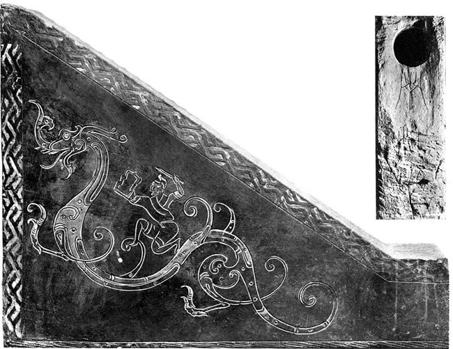 砖上的龙有两种形象:一种是武士御龙图中的龙,长约88厘米、高约40厘米。这条龙身躯修长,呈波浪起伏之状,尾巴上卷,身上面装饰有长条形和圆形图案。龙头上有一对长角,角尖呈螺旋状,龙口大张,露出长长的舌头和六枚牙齿。图上只画出两条腿,足呈鹰爪状,有三爪。龙背上有一名手持短剑和盾牌的武士;另一种是画面中只有一条龙(图2),龙的形状、姿态与前一种龙很像,但局部有一些差别。