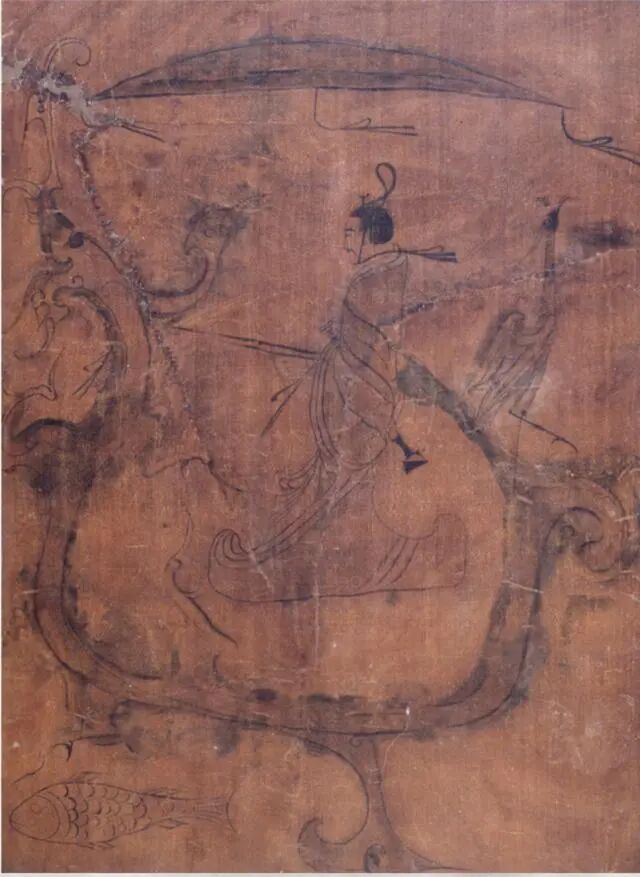 说到中国绘画里的龙,不能不提到战国时期的《人物御龙图》,这是战国中晚期佚名创作的绢本水墨淡设色画作,1973年出土于长沙子弹库楚墓一号墓穴,出土时平放在椁盖板与棺材之间,现收藏于湖南博物院。