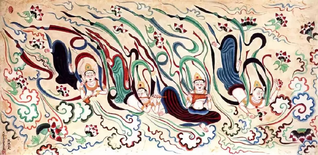 佛教音乐经过唐代的创新,与民间音乐渐趋融合,加入了说唱的元素。佛教音乐主要以人声和乐曲为主。人声是语言的吟诵、唱念,乐曲则是曲调和音律的结合。但二者之间也是相辅相成, 和谐统一,这也正和佛教中的“谐理相符”。人声在吟诵过程中,也要有一定的音律规则,要根据经文的内容,声音有高有低,甚至要唱念出曲调的旋律。因此,佛曲的音律规整、梵音谐和、内容表达直白、朗朗上口,达到“声瑟合一,琴鸣呼应” 的效果。任何一种音乐都有其自身的风格、音律、曲式和旋律,佛教音乐也不例外。