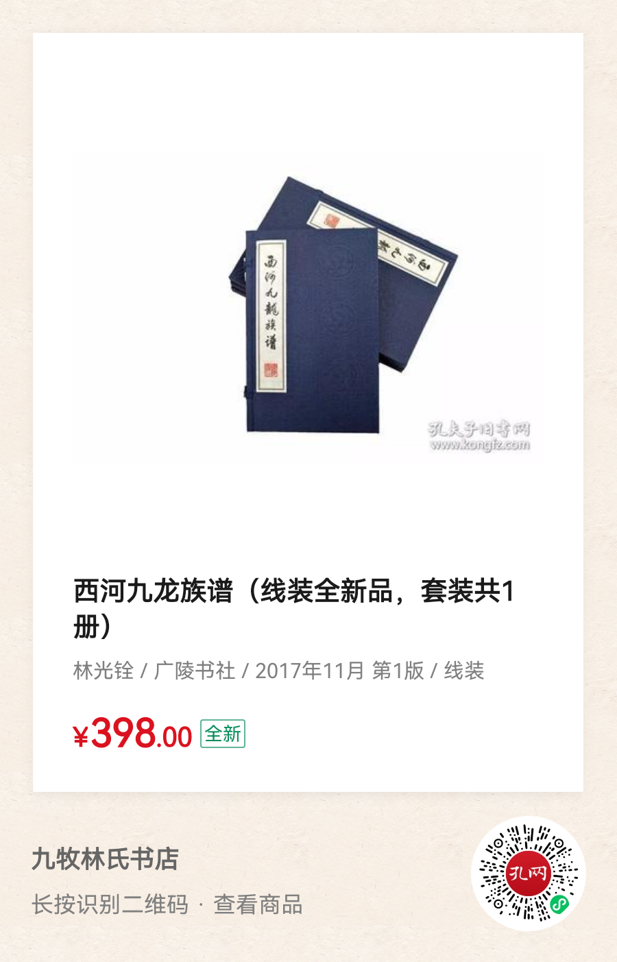 2017年,经多方努力,清光绪三年(1877年)于新加坡古友轩出版的《西河九龙族谱》在江苏广陵书社重新出版,全书采用宣纸印刷,族谱载有宋仁宗题林氏族谱的御制诗(其中最有名的是“忠孝有声天地老,古今无数子孙贤”)、宋淳熙元年(公元1174年)朱熹题写“长山世谱”、至圣先师孔子书“殷比干墓”、唐开元四年所发现的铜盘铭文、重修殷太师比干墓碑记、重修晋安郡王(林禄公)涂岭墓碑记、九牧墓碑记、长林世纪、披公墓道碑记、唐贞元甘露旌表敕牒、林氏正宗源流族谱序等重要文献,同时刊有比干公、坚公、放公、禄公、景公、绥公、格公、靖之公、遂之公......玄泰公、万宠公、披公、九牧兄弟(苇公、藻公、著公、荐公、晔公、蕴公、蒙公、迈公、蔇公),再到天上圣母妈祖,均有画像和像赞,详细记载了从林禄公开始往下的各代林氏先祖的简要生平、夫人及子嗣情况。族谱最后,还载有林光铨所撰后记并写明“族谱印版仍存新加坡古友轩”,希望有机会能够一睹原版族谱。这部重新出版的《西河九龙族谱》是研究、关注林氏文化的宗亲最必要的一部参考资料。