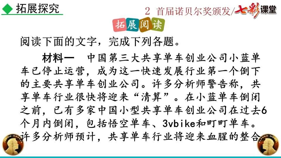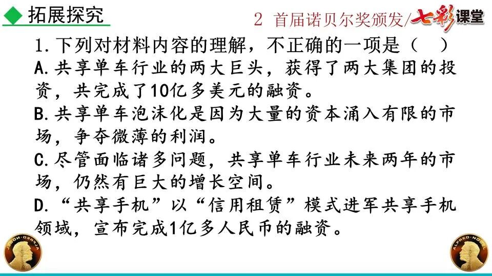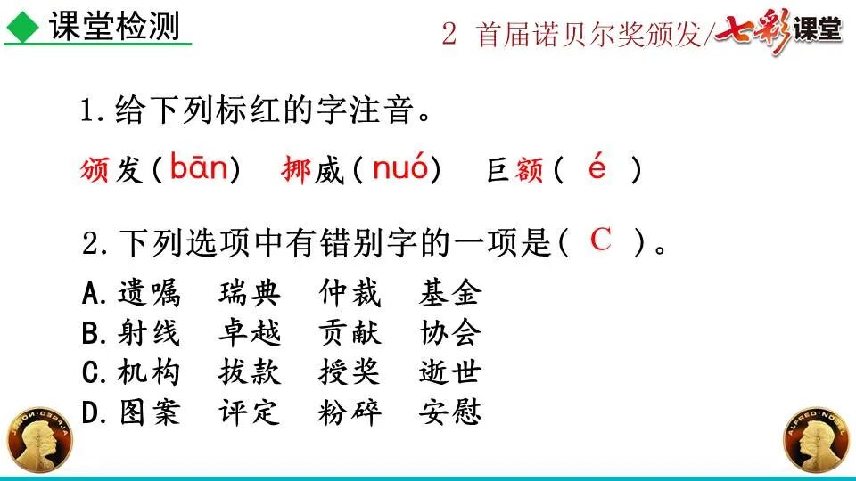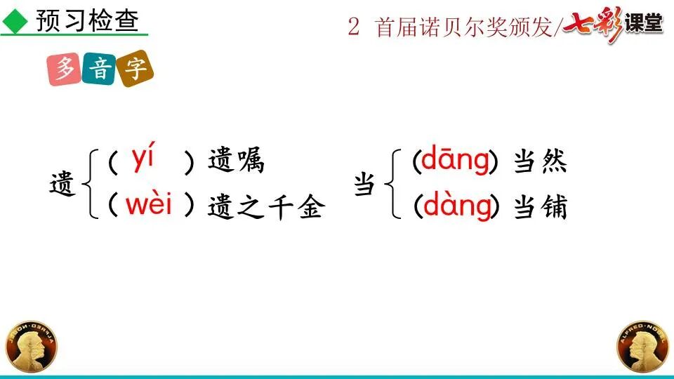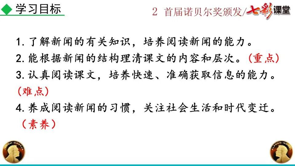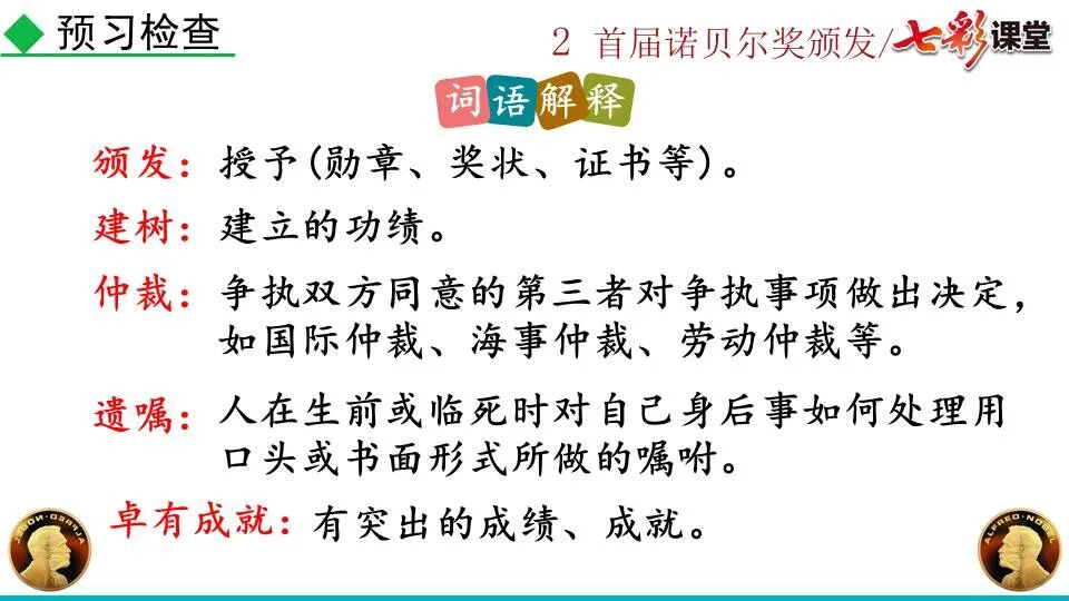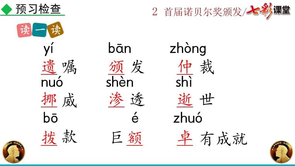 第一部分:( )简单概括了新闻所报道的主要内容及诺贝尔奖的由来。第二部分:( )报道了当年诺贝尔奖的获得者以及有关诺贝尔奖的知识。 1. “路透社斯德哥尔摩1901年12月10日电”属于什么内容?有什么作用?( ):人在生前或临死前用口头或书面形式嘱咐身后事应如何处理A.本届中国戏剧梅花奖各场演出的上座率超高,显示出市民对传统戏剧的热情可见一斑。 B.有些科学家认为,转基因大米富含维生素A,可以有效改善发展中国家人们营养不良。 C.中国科技创新成果交流会永久落户羊城,这是广州加快建设国家创新型城市的硕果。 D.能否切实减轻学生课业负担,让他们快乐成长,是我国中小学教学工作的当务之急。 1.bān zhòng zhǔ é shèn chāo3. 第一部分:(1)简单概括了新闻所报道的主要内容及诺贝尔奖的由来。第二部分:(2-4)报道了当年诺贝尔奖的获得者以及有关诺贝尔奖的知识。1. 这是新闻的电头,交代了通讯社名称、发电地点、时间,表明消息材料真实可靠,报道及时。首句为新闻的导语部分,交代了事件的几个要素:人物、时间、事件,总括了新闻的内容,简洁明了,让读者一下子就明白了新闻所报道的具体内容。第二句交代了诺贝尔奖的来历及其具体分类和获奖条件,为读者普及了相关知识,便于读者更有效地读懂和了解新闻内容。3. 语段中一一列举了当年诺贝尔奖的各个门类的获奖者的国籍、姓名、所获得的奖项以及他们所做出的贡献,这些都充分体现了新闻内容的准确性和真实性。4. 交代了新闻背景,进一步介绍了诺贝尔奖奖金的来源,补充说明资金管理权与奖项评议权的分离,更有利于读者了解和认识诺贝尔奖,从而增强了新闻内容的真实性。